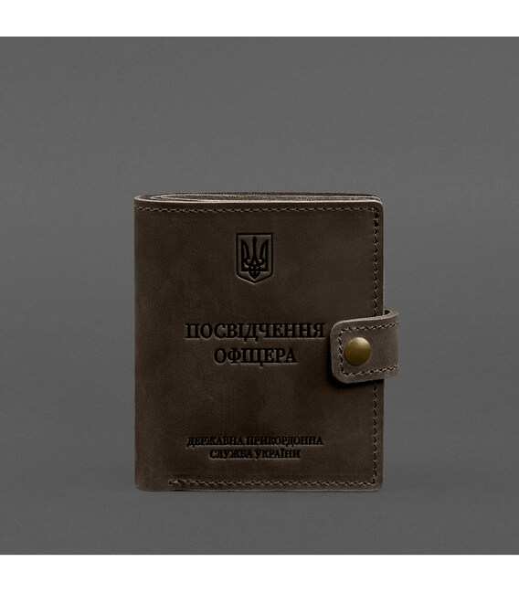 Шкіряна обкладинка-портмоне на Посвідчення офіцера Державної Прикордонної Служби України від бренду БланкНот спеціально розроблена для дбайливого зберігання вашого документа. Пошита з високоякісної натуральної шкіри crazy horse. Ця шкіра з вінтажним ефектом дуже міцна і довговічна. Тиснення на лицьовій стороні обкладинки повністю дублює оригінальний бланк документа. Вгорі розташований герб України, посередині міститься напис «Посвідчення офіцера». Внизу – тиснення «Державна Прикордонна Служба України».