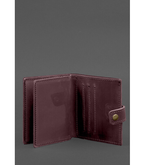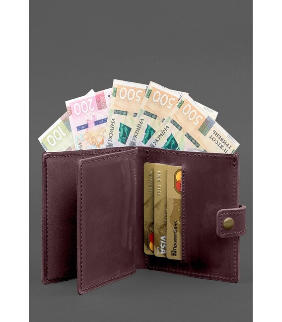Всередині є 1 відділення для купюр, 3 слоти для пластикових карт, прозора кишеня та відділення для документа. Закривається портмоне-обкладинка хлястиком з кнопкою.
