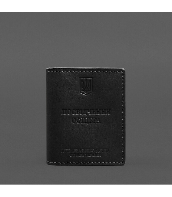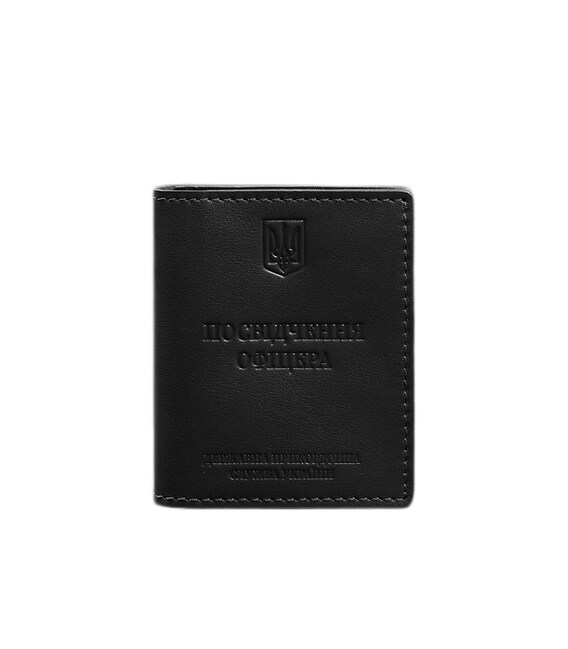 Шкіряна обкладинка на Посвідчення офіцера від бренду БланкНот спеціально розроблена для дбайливого зберігання вашого документа. Пошита з високоякісної натуральної шкіри краст Ця шкіра дуже міцна і довговічна. Тиснення на лицьовій стороні обкладинки повністю дублює оригінальний бланк документа. Вгорі розташований герб України, посередині міститься напис «Посвідчення офіцера», нижче – «Державна Прикордонна Служба України»