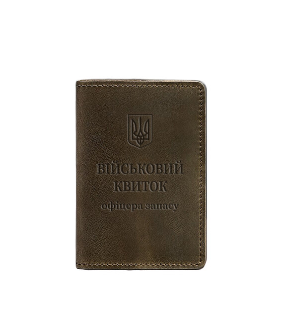 Шкіряна обкладинка на військовий квиток офіцера запасу від бренду БланкНот спеціально розроблена для дбайливого зберігання вашого документа. Пошита з високоякісної натуральної шкіри crazy horse. Ця шкіра з вінтажним ефектом дуже міцна і довговічна. Тиснення на лицьовій стороні обкладинки повністю дублює оригінальний бланк документа. Вгорі розташований герб України, посередині міститься напис «Військовий квиток офіцера запасу»