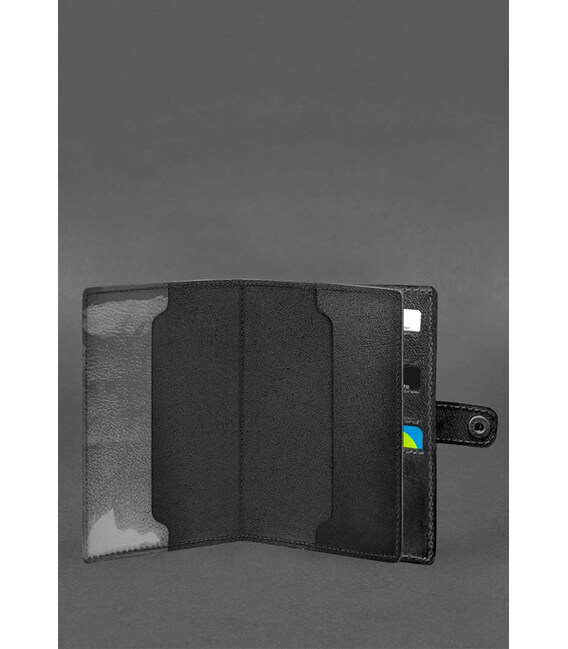 Всередині є 1 відділення для купюр, 5 слотів для пластикових карт, одна прозора кишеня та відділення для документа. Закривається обкладинка-портмоне хлястиком з кнопкою.