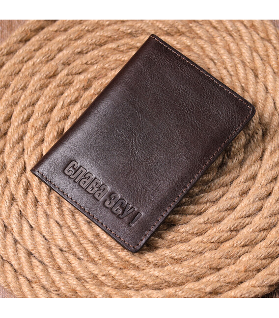 Практична шкіряна обкладинка для військового квитка, коричневого кольору з патріотичним тисненням "Слава ЗСУ", на лицьовій стороні. Виріб пошитий із якісної італійської шкіри із високим показником зносостійкості, яка захистить від пошкоджень документ на дуже довгий час. Аксесуар має розворот для військового квитка, два осередки для карток, без застібки, упакований у фірмовий чохол.