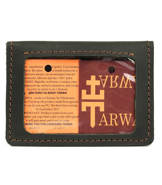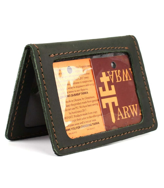Обкладинка шкіряна для посвідчення, ID паспорта, TARWA RE-0114-4sa зелений з натуральної кінської шкіри зеленого кольору, матова фактура. Розмір 7*10*1см. Усередині розташовано два прозорі відділення для посвідчення водія та тех.паспорти на автомобіль нового зразка + одне прозоре відділення зовні. Також може використовуватися для ID паспорта нового зразка та інших документів відповідного розміру (банківська картка, різні посвідчення, картка знижок і т.д. розміром 86*55 мм).