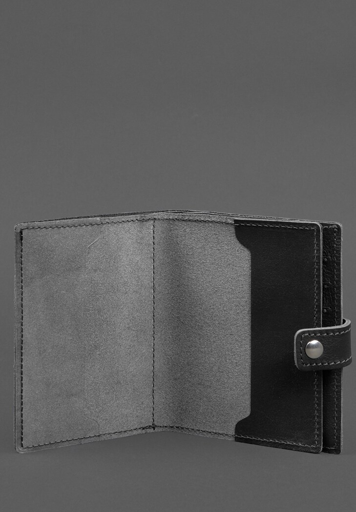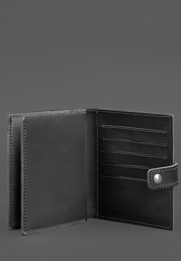 Всередині є 1 відділення для купюр, 5 слотів для пластикових карт, одна прозора кишеня та відділення для документа. Закривається портмоне-обкладинка хлястиком з кнопкою.