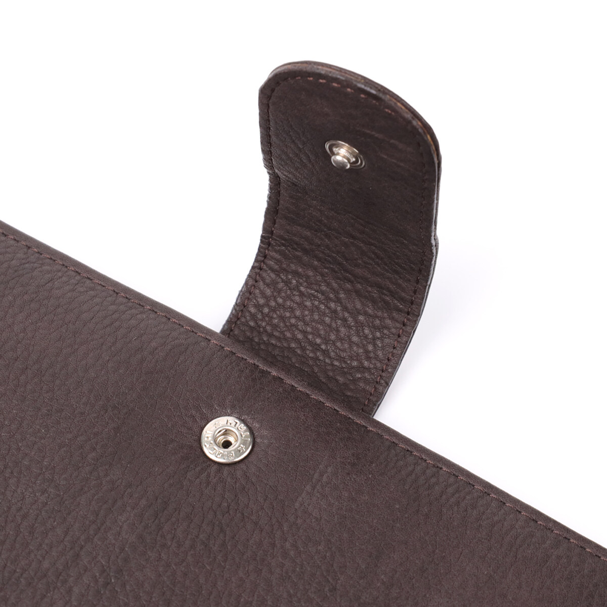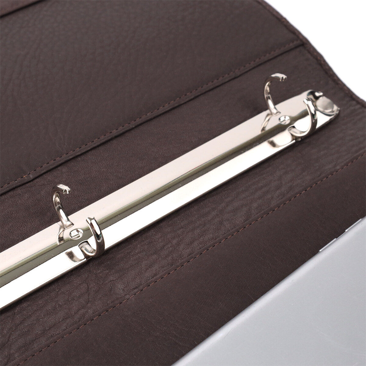 Органайзер із натуральної шкіри коричневого кольору. Закривається хлястиком на кнопку – надійно та зручно. Усередині передбачено вісім осередків для карт, три прилеглі кишені та металевий тримач для файлів формату А4. На лицьовій стороні в правому нижньому кутку розташований фірмовий металевий логотип бренду, що підкреслює стиль і автентичність виробу.