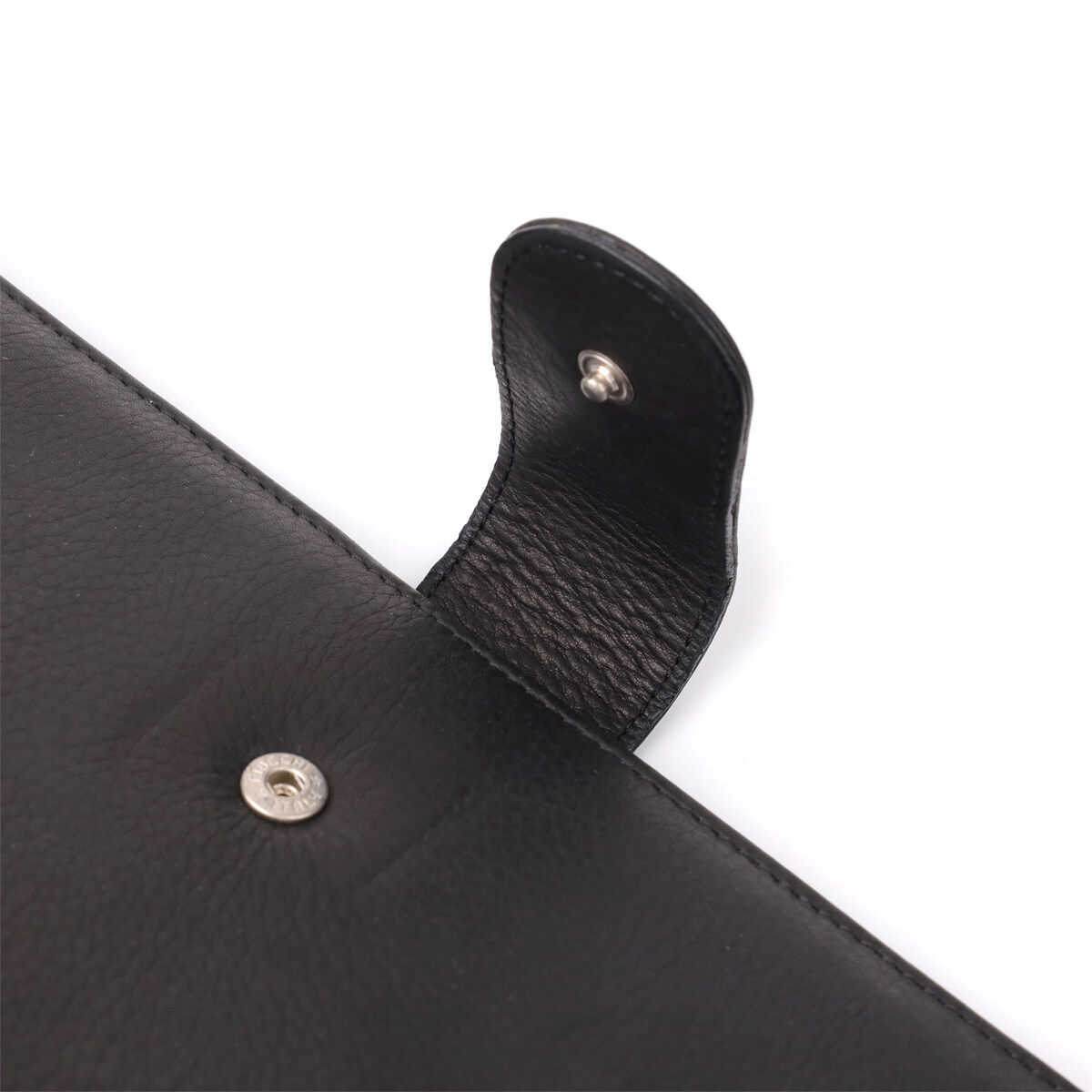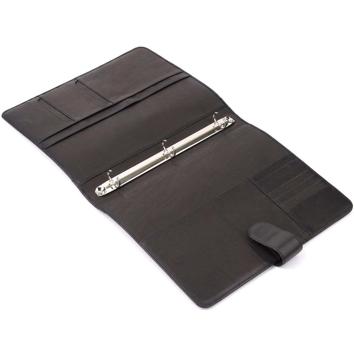 Органайзер із натуральної шкіри чорного кольору. Закривається хлястиком на кнопку – надійно та зручно. Усередині передбачено вісім осередків для карт, три прилеглі кишені та металевий тримач для файлів формату А4. На лицьовій стороні в правому нижньому кутку розташований фірмовий металевий логотип бренду, що підкреслює стиль і автентичність виробу.