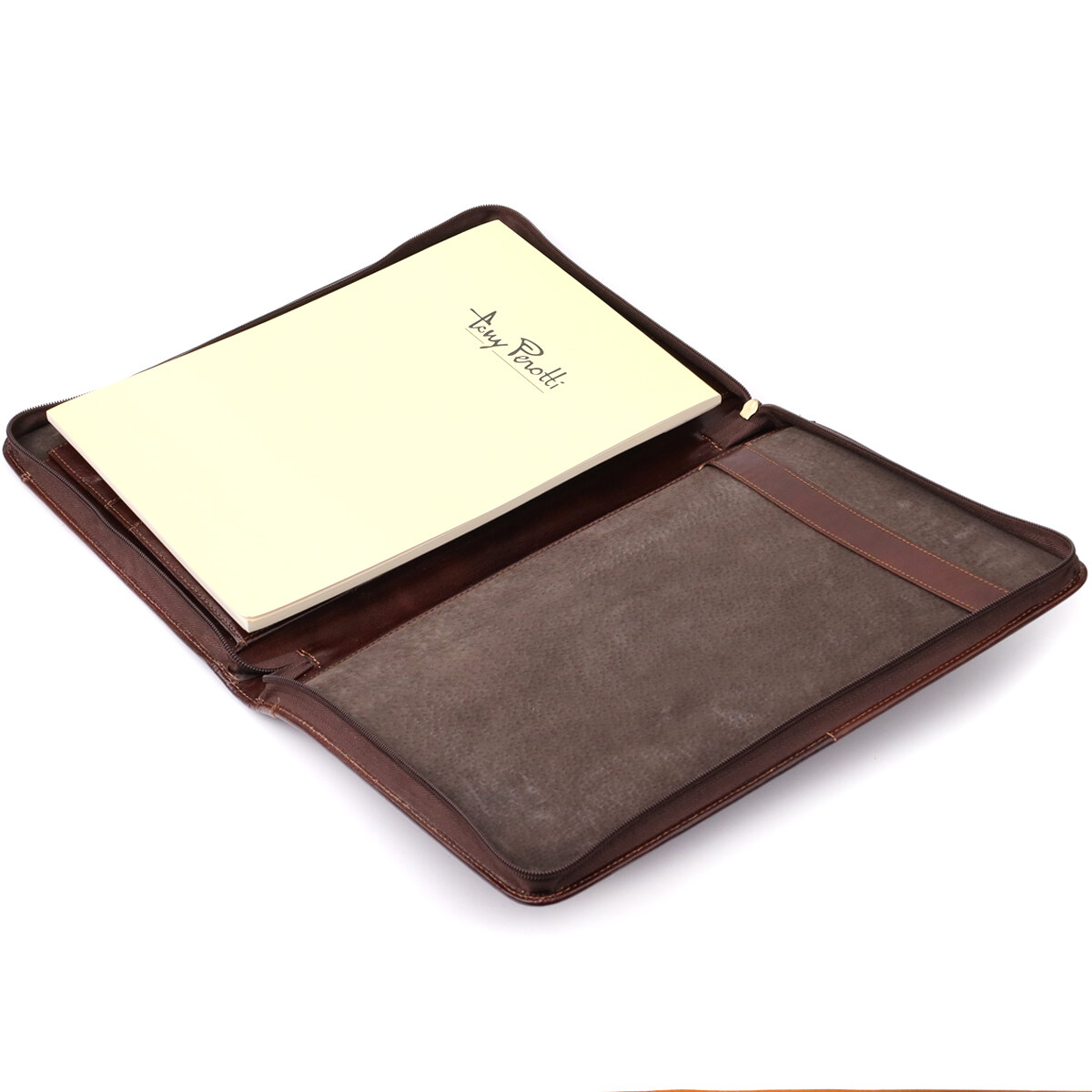 Елегантна шкіряна папка з блокнотом від італійського бренду Tony Perotti – стильне та функціональне рішення для роботи та ділових зустрічей. Виріб виконаний з натуральної гладкої шкіри, оснащений продуманими внутрішніми відділеннями для зберігання документів, ручок та карток, а змінний блокнот робить аксесуар універсальним та практичним. Лаконічний дизайн, тиснення бренду та італійська якість підкреслюють оригінальність та статус власника, а також роблять папку чудовим подарунком.