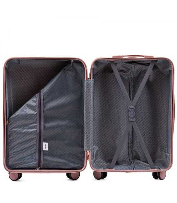 Чемодан WINGS з серії DOVE створений для клієнтів, які цінують елегантність, комфорт і модний дизайн. Виготовлений з міцного пластику ABS з перламутровим покриттям. Ідеально підходить для складних умов, так що, незалежно від погоди, валізи будуть виглядати феноменально. Матеріал і якість виготовлення гарантують високу стійкість до пошкоджень і подряпин. Оздоблювальні елементи в самому дизайнерському кольорі цього сезону - рожеве золото.