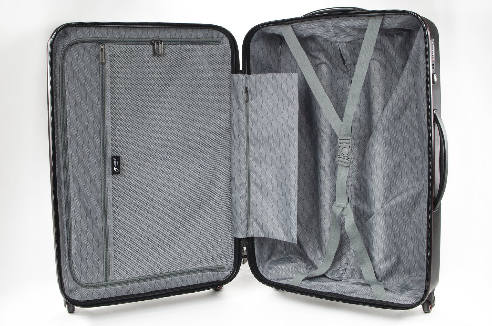 В валізи є 2 відділення: одне з фіксуючими ременями, інше закривається на блискавку. Зверху і збоку валізи розташовані стаціонарні ручки для ручного перенесення в вертикальному або горизонтальному положеннях. Є висувна телескопічна ручка на металевій основі з кнопкою для фіксації висоти.