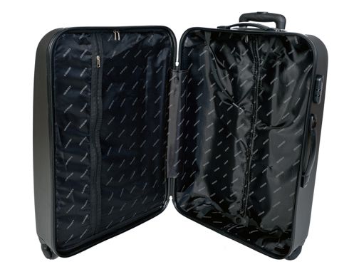 Валіза має 4 пластикових коліщатка, які крутяться на 360 °, а також 4 пластикові ніжки. Закривається чемодан за допомогою блискавки з двома «собачками», а також кодового замка. «Собачки» мають спеціальні отвори для навісного замка. Виріб має дві ручки для перенесення валізи в руці і висувну телескопічну триступеневу ручку для перевезення валізи. Матеріал висувною ручки - міцний і легкий алюміній, а її максимальна висота - 41 см. Деталь оснащена спеціальною кнопкою-фіксатором. Усередині валізи є два великих відділення. Одне відділення оснащено спеціальним еластичним кріпленням. Друге відділення застібається за допомогою блискавки. Також аксесуар має один прорізний кишеню-сітку на блискавці. Матеріал підкладали: щільна тканина. Матеріал: міцний фактурний пластик. Матеріал коліщаток: поліуретан.