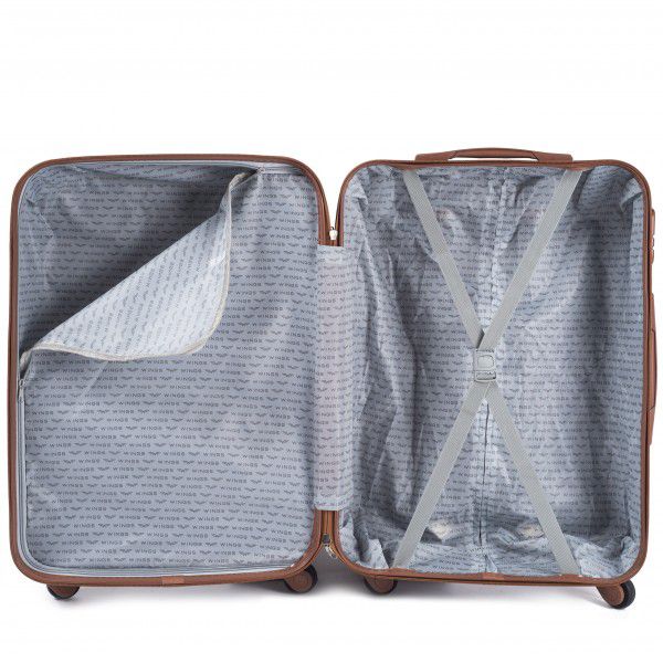Валіза на коліщатках Wings виповнена з надійного ударостійкого сплаву пластику ABS, що дозволяє їй бути міцною і легкою, а також вікористовувати для будь-яких подорожей. Валіза має жорстку форму. Виріб закривається на молнію. Чемодан оснащений телескопічною ручкою на металевій основі і підйомною пластиковою ручкою на бічній поверхні, а також ручкою, яка розташована зверху валізи. Чотири колеса повертаються на 360 градусів. Є кодовий замок для збереження речей. Усередині виробу є притискні ремені для багажу. На іншій бічній поверхні розташовані невеликі пластикові ніжки. Валіза має водовідштовхувальні властивості і стійкість до вигоряння.
