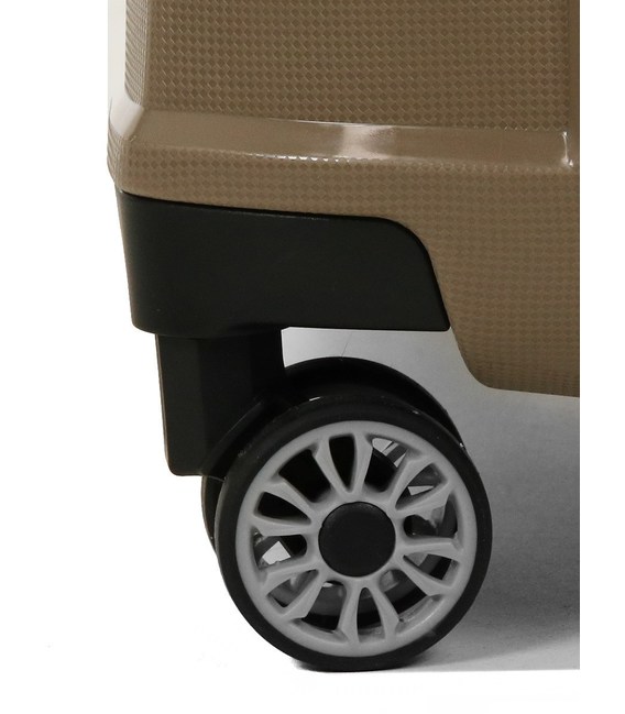 - 4 подвійних колеса з основою з ТПУ (Термополиуретан) кріпленням зі сталі та інноваційної (без шурупів) системою кріплення колісного блоку до корпусу (максимум надійності при експлуатації і здачі в багаж).