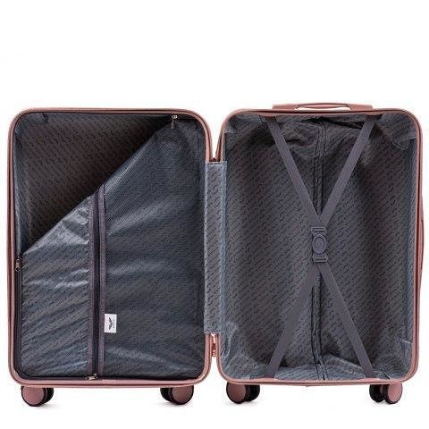 Чемодан WINGS з серії DOVE створений для клієнтів, які цінують елегантність, комфорт і модний дизайн. Виготовлений з міцного пластику ABS з перламутровим покриттям. Ідеально підходить для складних умов, так що, незалежно від погоди, валізи будуть виглядати феноменально. Матеріал і якість виготовлення гарантують високу стійкість до пошкоджень і подряпин. Оздоблювальні елементи в самому дизайнерському кольорі цього сезону - рожеве золото.