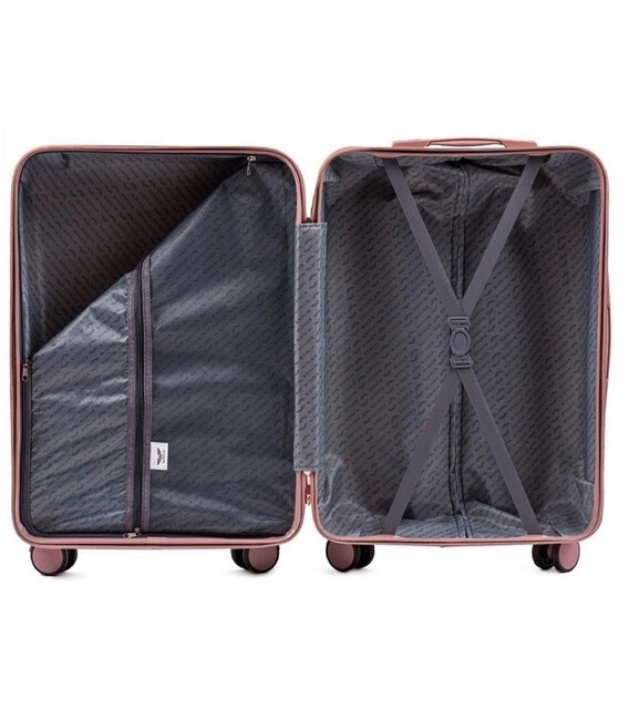 Чемодан WINGS з серії DOVE створений для клієнтів, які цінують елегантність, комфорт і модний дизайн. Виготовлений з міцного пластику ABS з перламутровим покриттям. Ідеально підходить для складних умов, так що, незалежно від погоди, валізи будуть виглядати феноменально. Матеріал і якість виготовлення гарантують високу стійкість до пошкоджень і подряпин. Оздоблювальні елементи в самому дизайнерському кольорі цього сезону - рожеве золото.