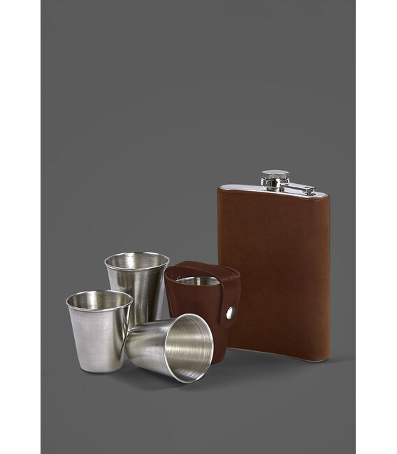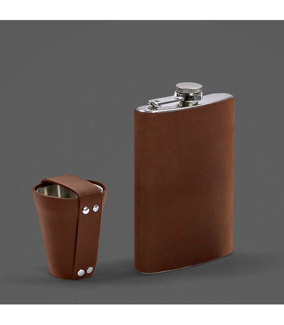 Набір складається с фляги обтягнутої натуральною шкірою та чотирьох чарок в шкіряному чохлі. Компактна фляжка може містити мінімальну кількість алкоголю для компанії близьких друзів.