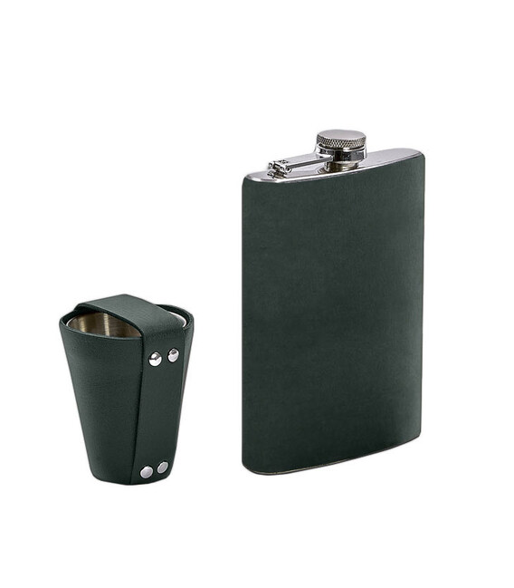 Набір складається с фляги обтягнутої натуральною шкірою та чотирьох чарок в шкіряному чохлі. Компактна фляжка може містити мінімальну кількість алкоголю для компанії близьких друзів.