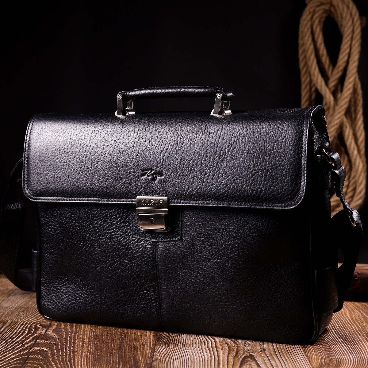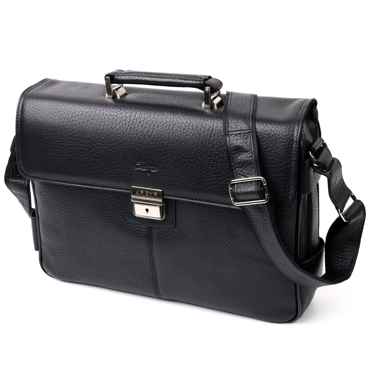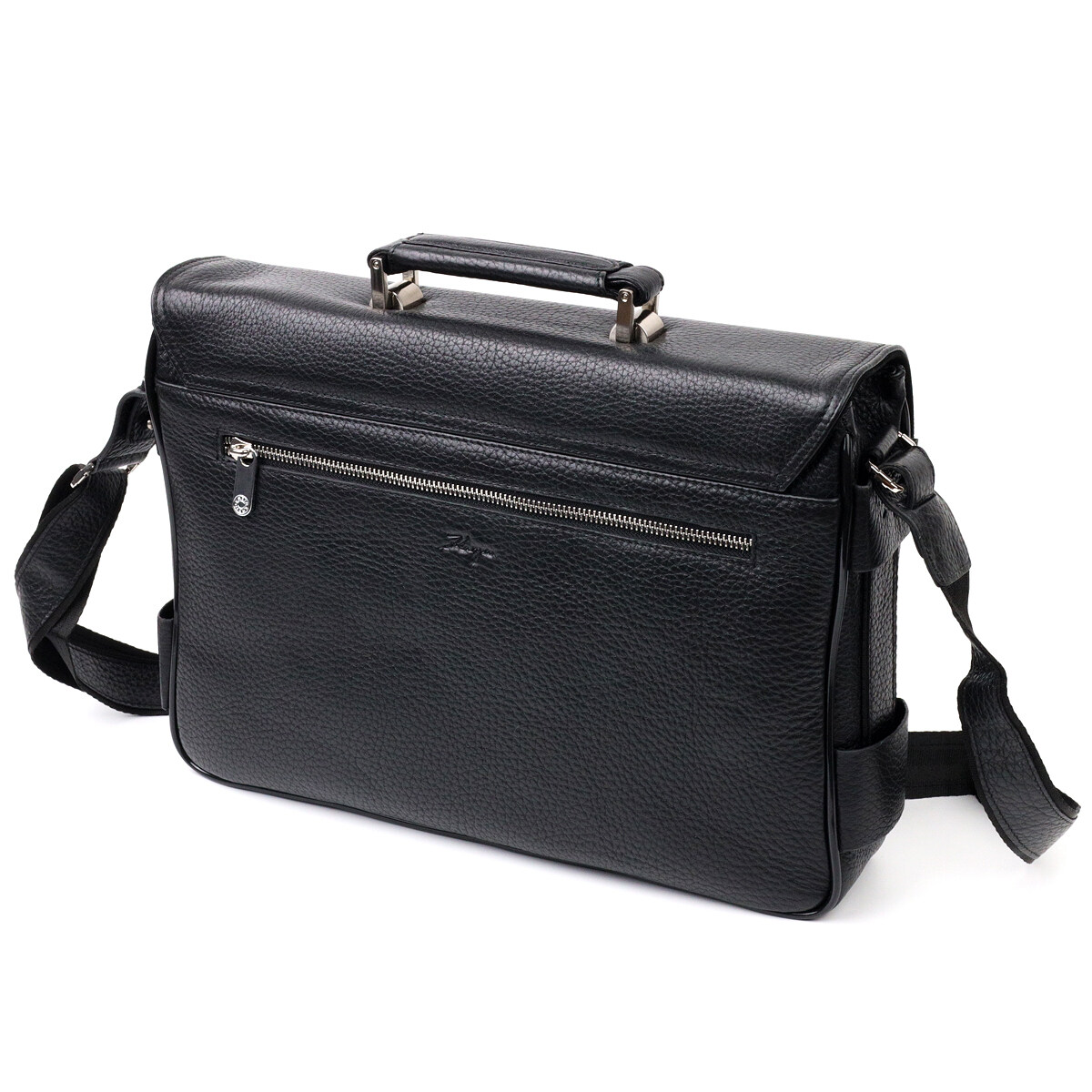 Класичний портфель із зернистої натуральної шкіри, чорного кольору. Зручна та багатофункціональна модель, клямка закривається на ключик. Модель доповнена фурнітурою кольору срібла плюс гумові ніжки для захисту зовнішнього дна сумки. Усередині сумки якісна підкладка. Сумку можна переносити в руці за допомогою зручної шкіряної ручки, а також через плече (у комплекті не знімний, регульований плечовий ремінь, який виконаний у комбінації текстильного матеріалу та натуральної шкіри). Буде ідеальним варіантом для подарунка близькій людині.