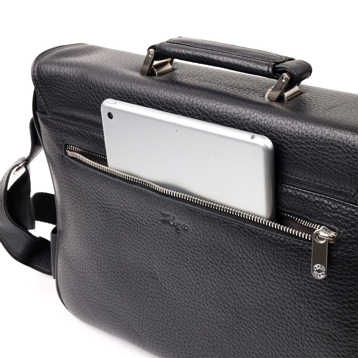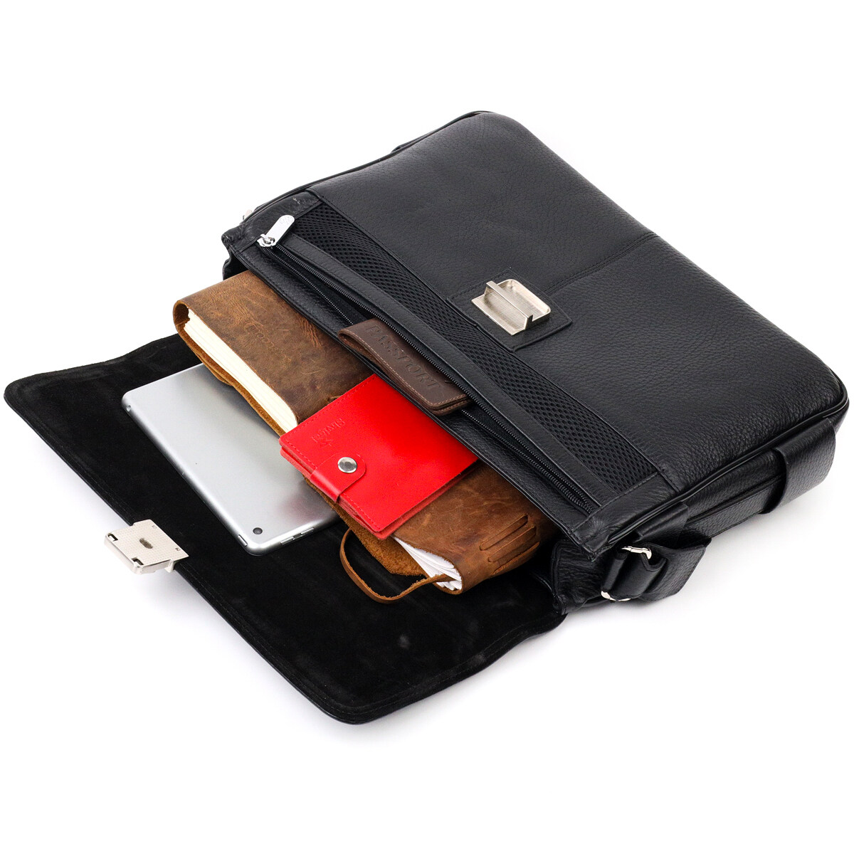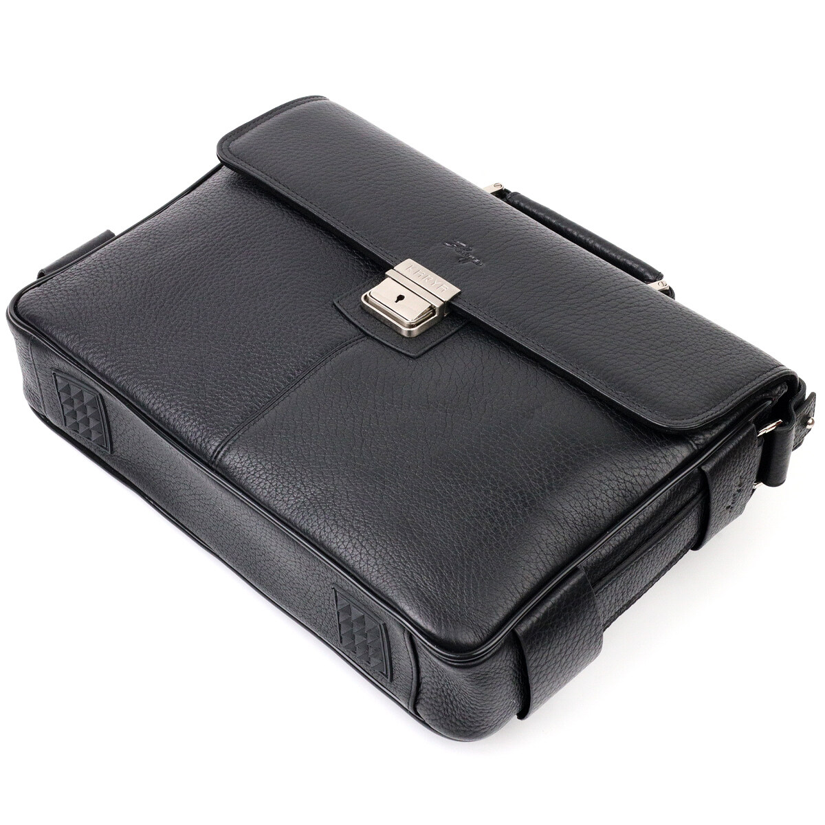 Класичний портфель із зернистої натуральної шкіри, чорного кольору. Зручна та багатофункціональна модель, клямка закривається на ключик. Модель доповнена фурнітурою кольору срібла плюс гумові ніжки для захисту зовнішнього дна сумки. Усередині сумки якісна підкладка. Сумку можна переносити в руці за допомогою зручної шкіряної ручки, а також через плече (у комплекті не знімний, регульований плечовий ремінь, який виконаний у комбінації текстильного матеріалу та натуральної шкіри). Буде ідеальним варіантом для подарунка близькій людині.