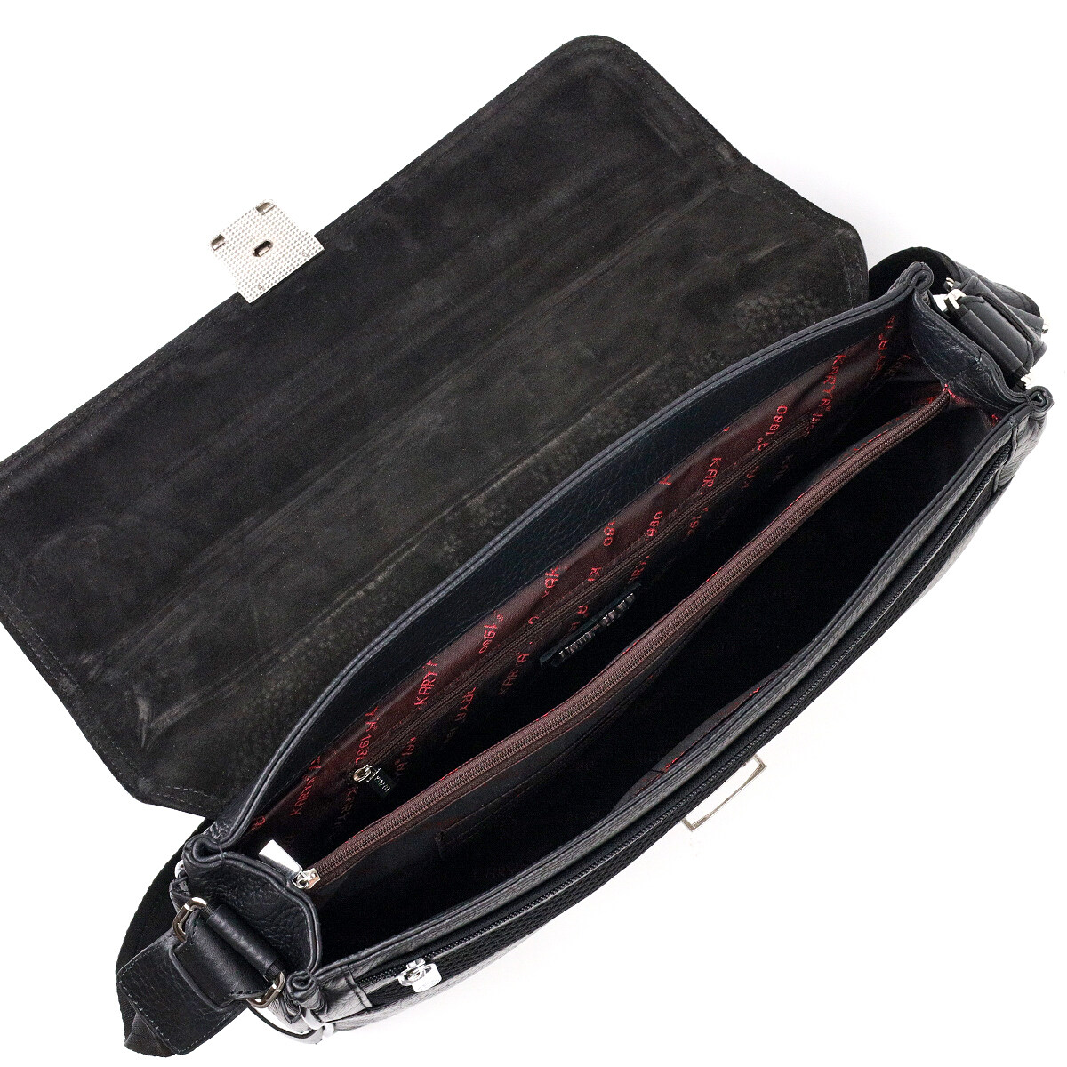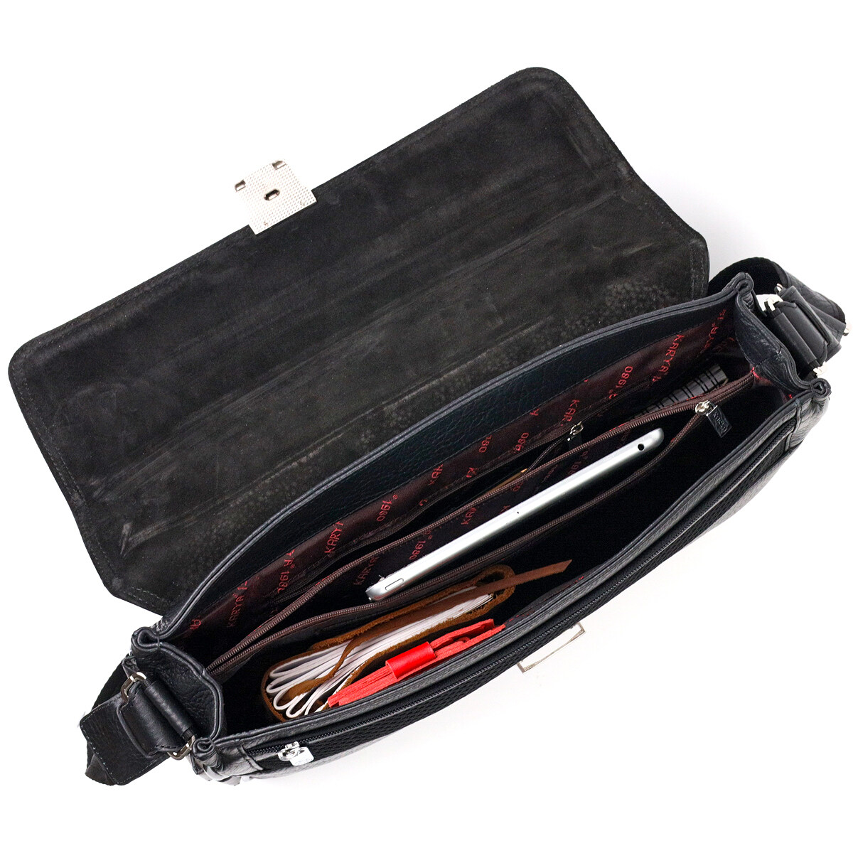 - всередині: кишеня-перегородка на блискавці, три відкриті кишені, 6 слотів для кредитних карток і потайна кишеня на блискавці;