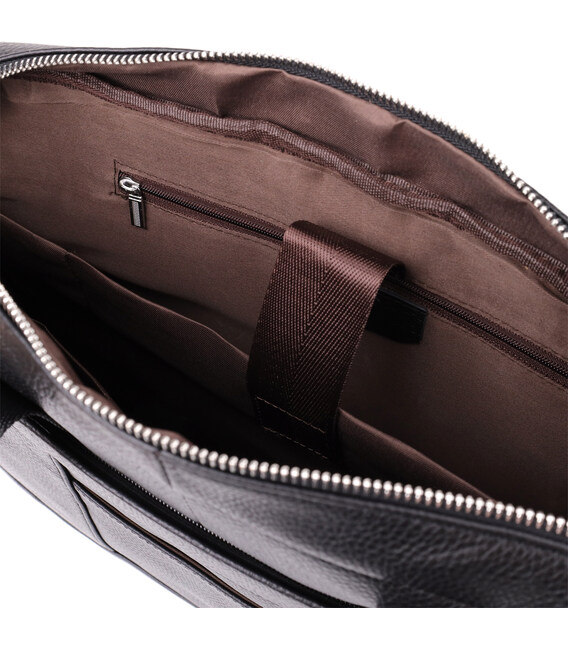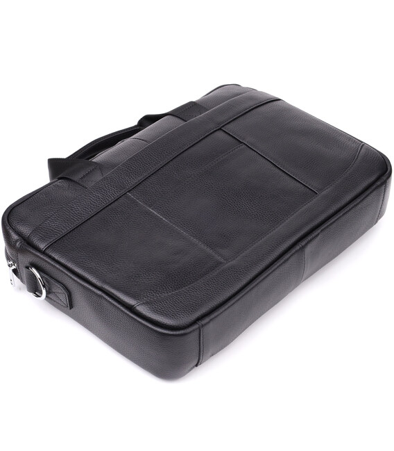 Стильний і функціональний шкіряний портфель чорного кольору, виготовлений з натуральної шкіри з міцним каркасом, ідеально підійде для ділових людей, які цінують комфорт та порядок. Сумка надійно зберігає форму та забезпечує захист вмісту, включаючи ноутбук до 15 дюймів та документи формату А4.