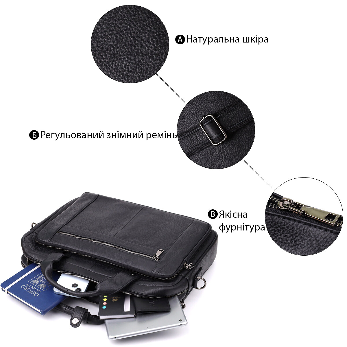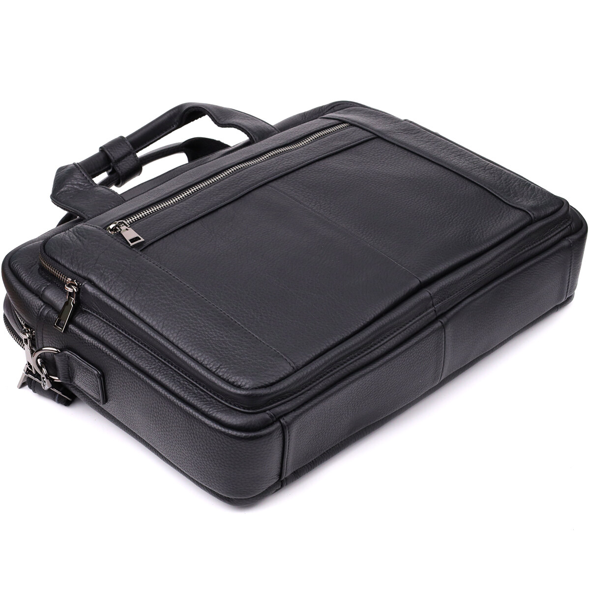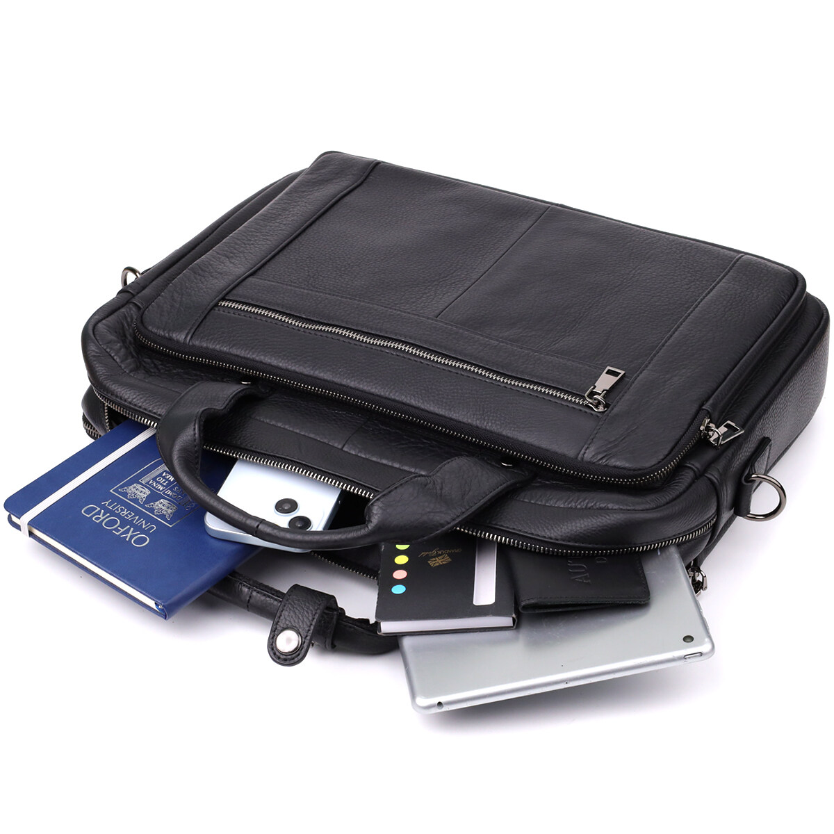 Портфель укомплектований двома міцними шкіряними ручками для перенесення в руках і знімним ремінцем, що регулюється, для носіння на плечі. Такий аксесуар стане надійним супутником у поїздках, на ділових зустрічах або в офісній повсякденності – все необхідне завжди під рукою, в одному акуратному та стильному рішенні.