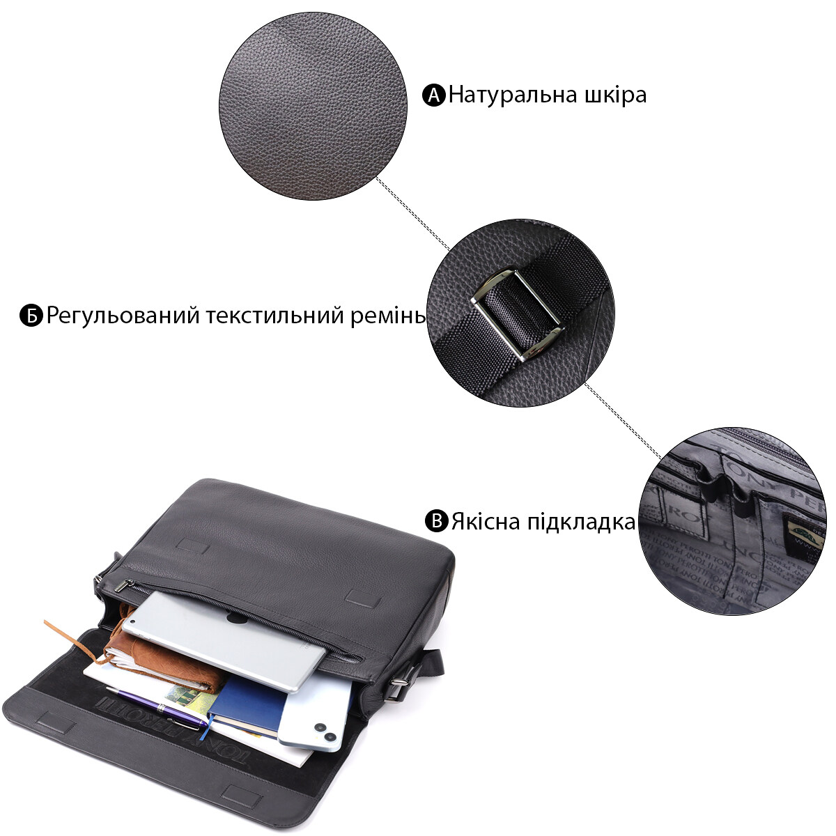 Чоловічий шкіряний портфель від італійського бренду Tony Perotti виконаний із натуральної зернистої шкіри та поєднує в собі елегантний дизайн та функціональність. Містке відділення з відсіком для ноутбука, додаткові кишені та зручний ремінь роблять аксесуар ідеальним для роботи та повсякденного використання. Металевий логотип та якісна фурнітура підкреслюють оригінальність та статус власника, а продумана організація простору забезпечує максимальний комфорт.