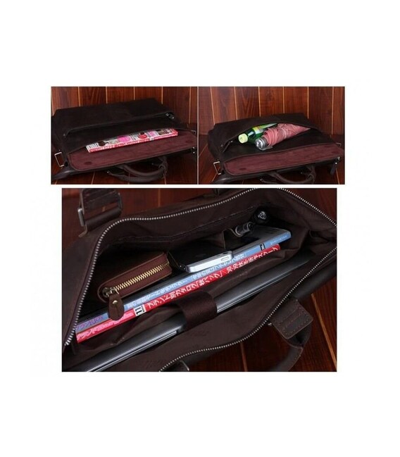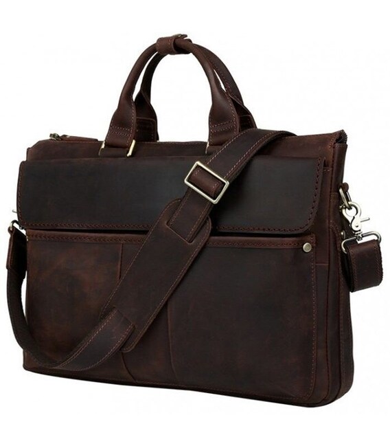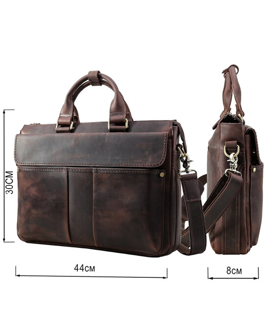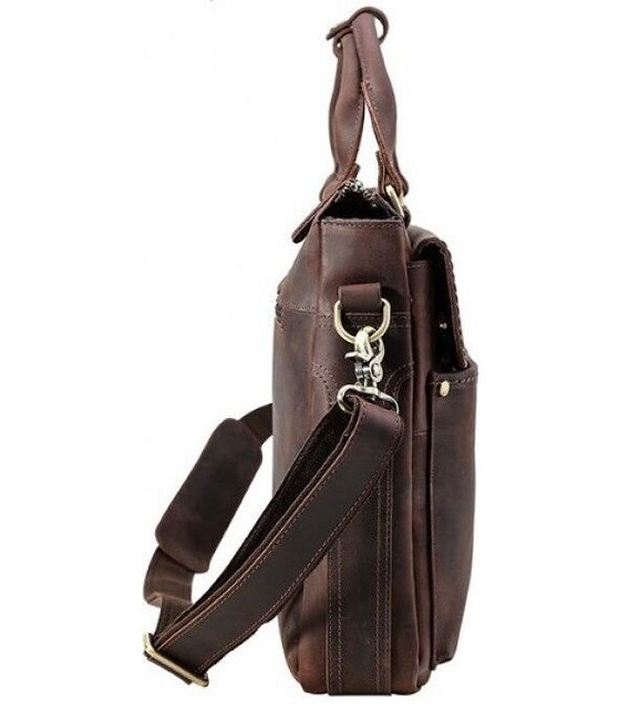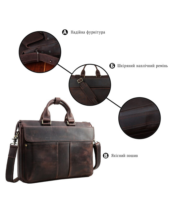 Вмістка чоловіча сумка з натуральної високоякісної шкіри. Колір фурнітури: латунь. Сумку можна носити в руці за допомогою шкіряних ручок, а також через плече, в комплекті плечовий ремінь, що знімається, з поєднання міцного текстилю та шкіри. Аксесуар прошитий коричневої міцною ниткою, що надає виробу міцності і оригінального вигляду. Аксесуар закривається на блискавку. На лицевій стороні виробу розташовані дві кишені, одна на блискавці, інша під клапаном на магнітах. На задній зовнішній стороні знаходиться відділення на блискавці. Підкладка виконана з міцного текстильного матеріалу чорного кольору.
