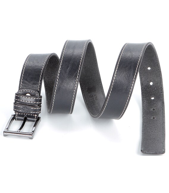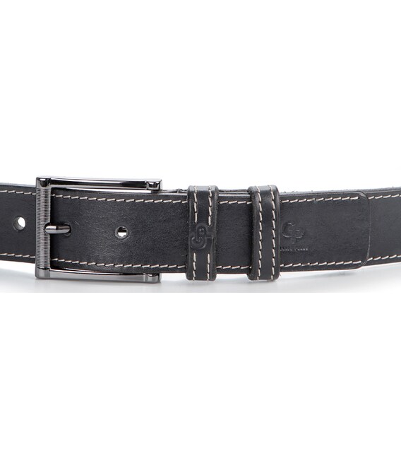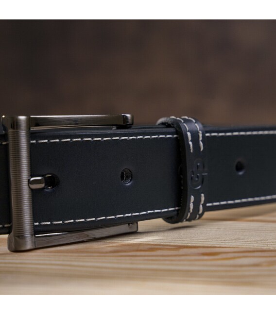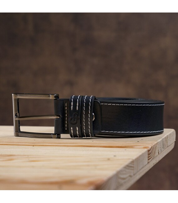 Брючний ремінь з натуральної високоякісної шкіри чорного кольору, який стильно доповнює біла строчка по краях. Цей елемент дизайну робить його більш сучасним, ніж звичайний класичний ремінь. Ремінь упакований в красиву коробку і стане чудовим подарунком для чоловіка. Порадуйте себе або кого-небудь презентабельним і практичним виробом!