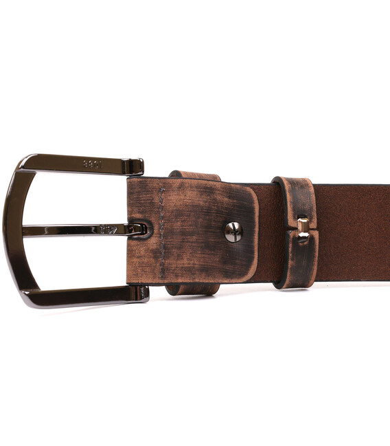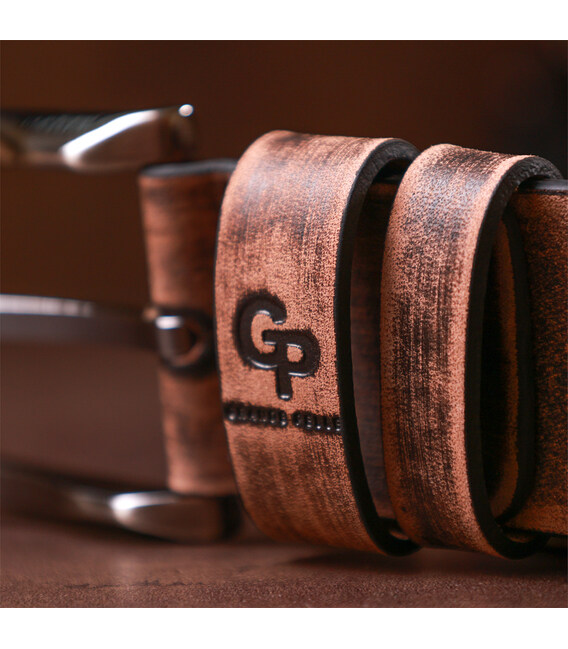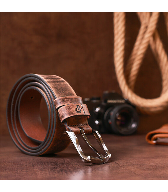 Оригінальний чоловічий ремінь під джинси. Аксесуар зроблений у вінтажному стилі, має потертості, які надають виробу родзинку. Колір фурнітури: темне срібло. Аксесуар надійно упакований в красиву коробочку від виробника. Шкіряний джинсовий чоловічий ремінь - це відмінне рішення для подарунку чоловікові до будь-якого свята.