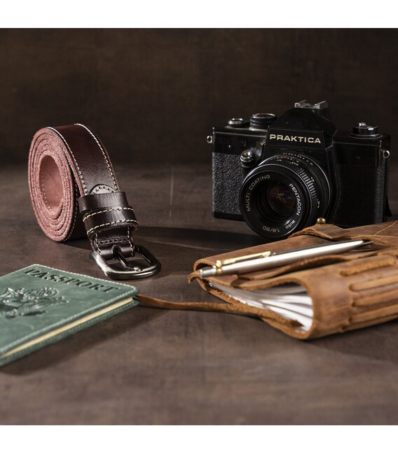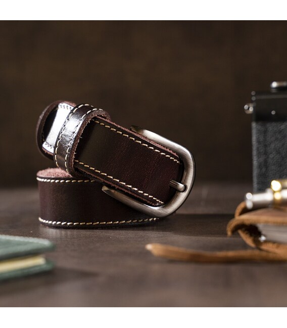 Ремінь преміум класу з високоякісної натуральної шкіри. Доповнено аксесуар солідною пряжкою з надійного металевого сплаву. Ремінь регулюється по довжині в меншу сторону, зробити це дуже просто, потрібно всього лише відкрутити гвинтик біля пряжки, відрізати зайву частину і прикрутити назад. Виріб доповнено рівним світлим рядком на лицьовій стороні, яка надає індивідуальності.