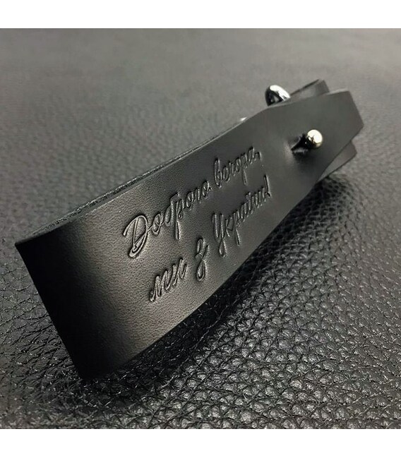 Пропонуємо до вашої уваги лімітовану серію брелоків з гравіюванням «Доброго вечора ми з України». Брелок виготовлений із натуральної ремінної шкіри. Ця шкіра надзвичайно міцна та зносостійка. Брелок із ремінної натуральної шкіри прослужить довгі роки.
