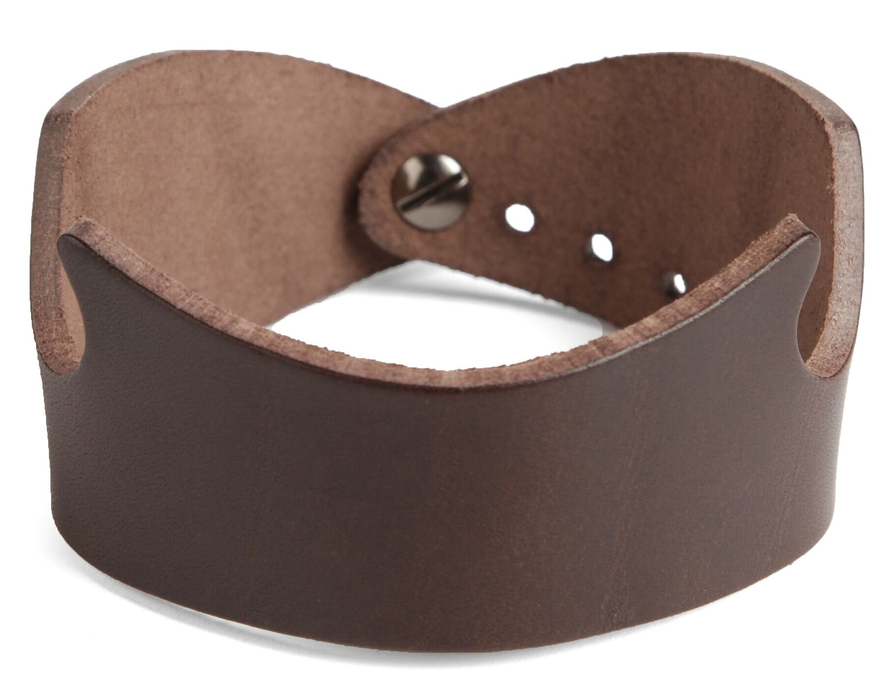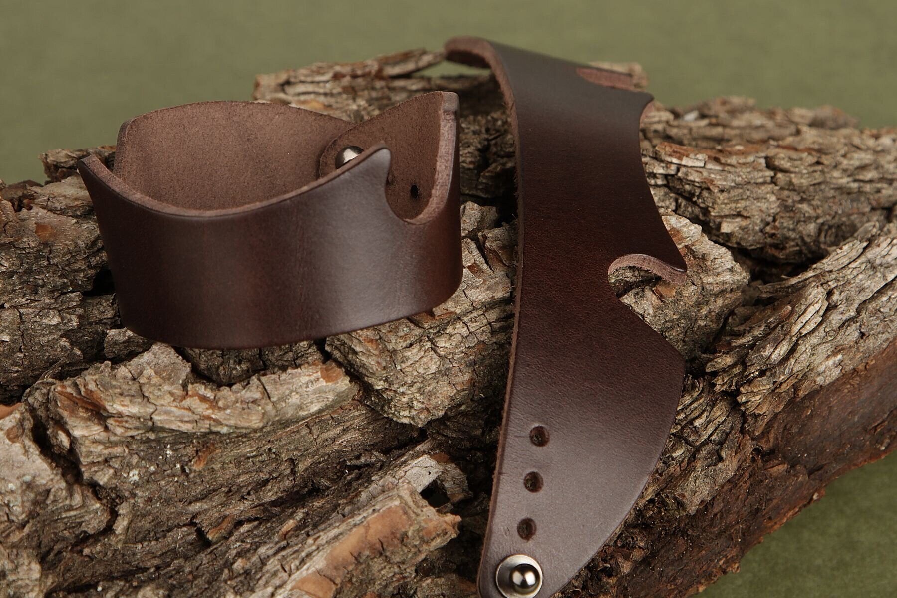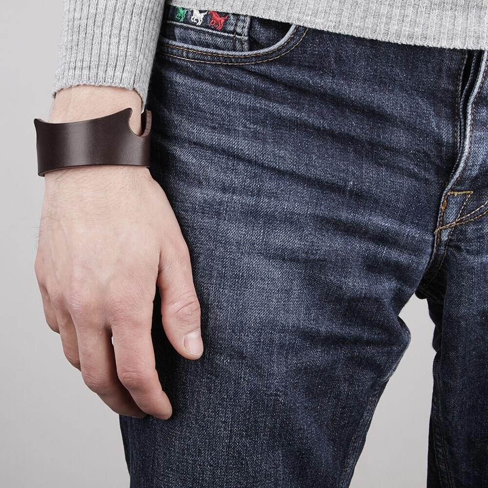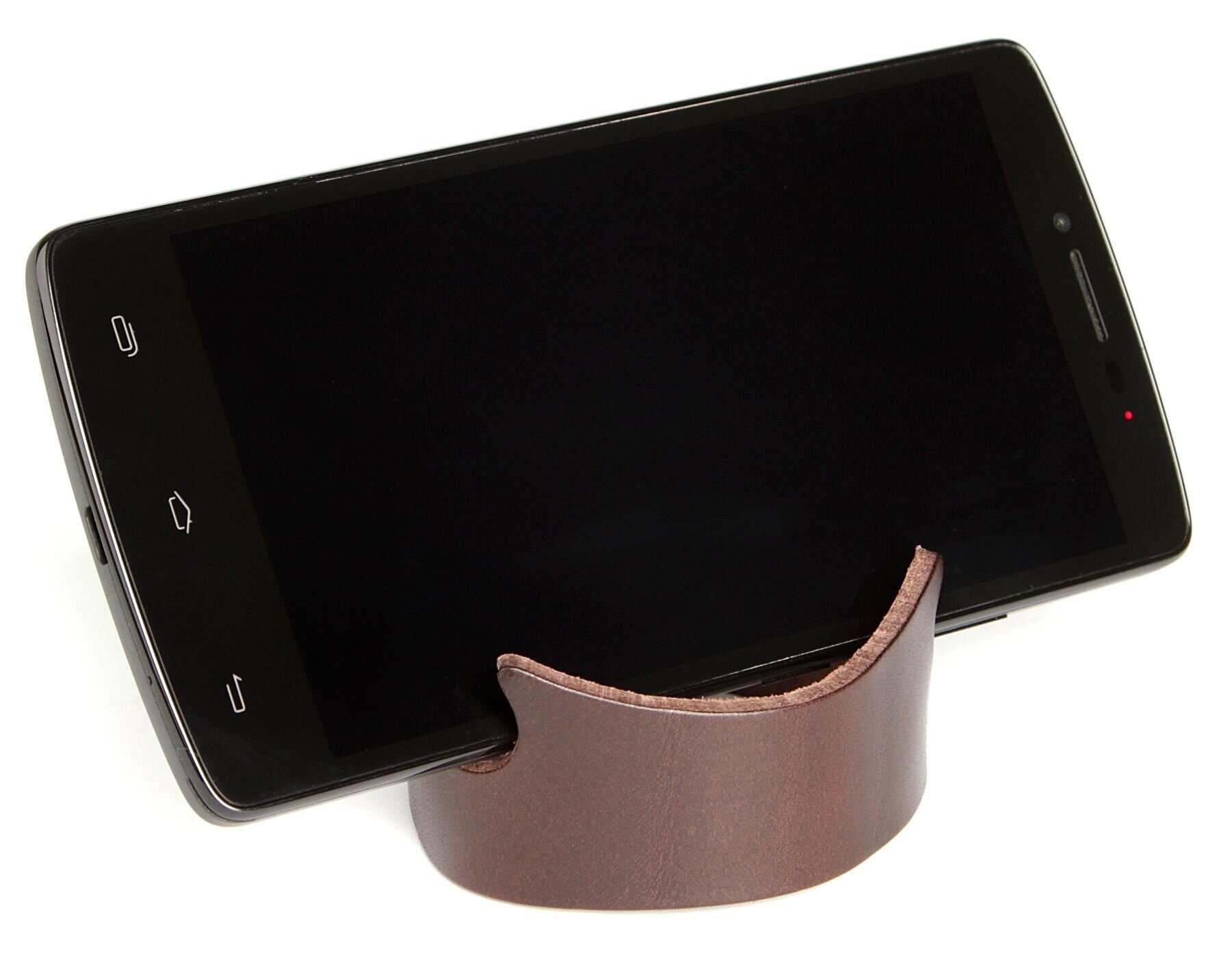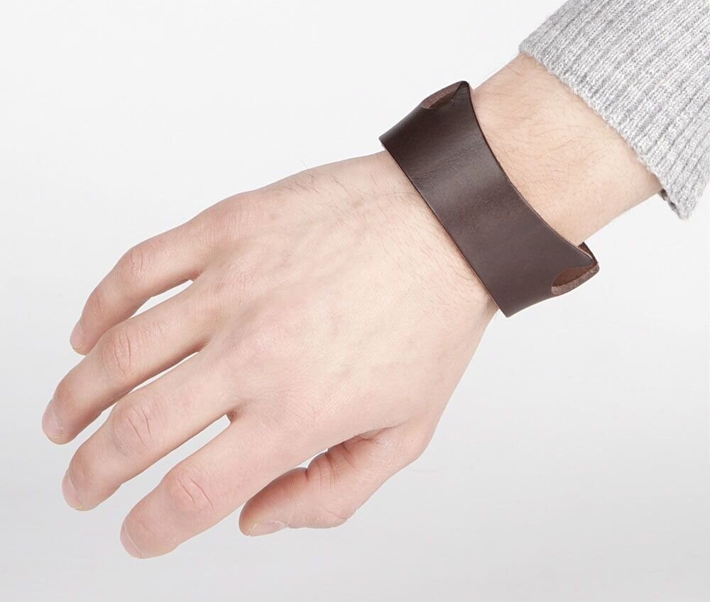 Шкіряний браслет оригінально виглядає на руці. Аксесуар можна використовувати в якості підставки для смартфона.