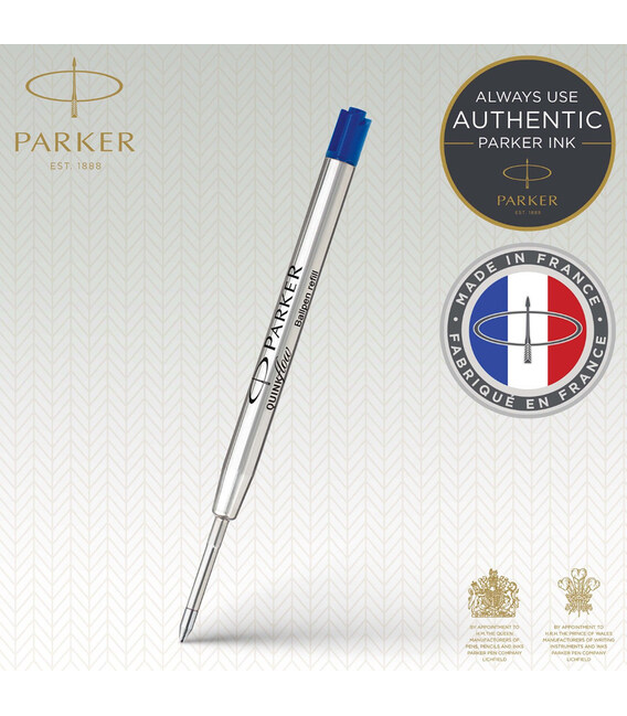Parker QuinkFlow 1950368 - оригінальний кульковий стрижень для використання у кулькових ручках Parker. Стрижень Parker QuinkFlow для кулькових ручок забезпечує плавний потік чорнила та рівномірно насичені лінії. Запас чорнила приблизно на лінію 3,5 км. Стрижень універсальний також для гелевих ручок Parker.Лінія письма – тонка (F = 0,8 мм). Колір чорнила - синій. Упаковка: блістер.