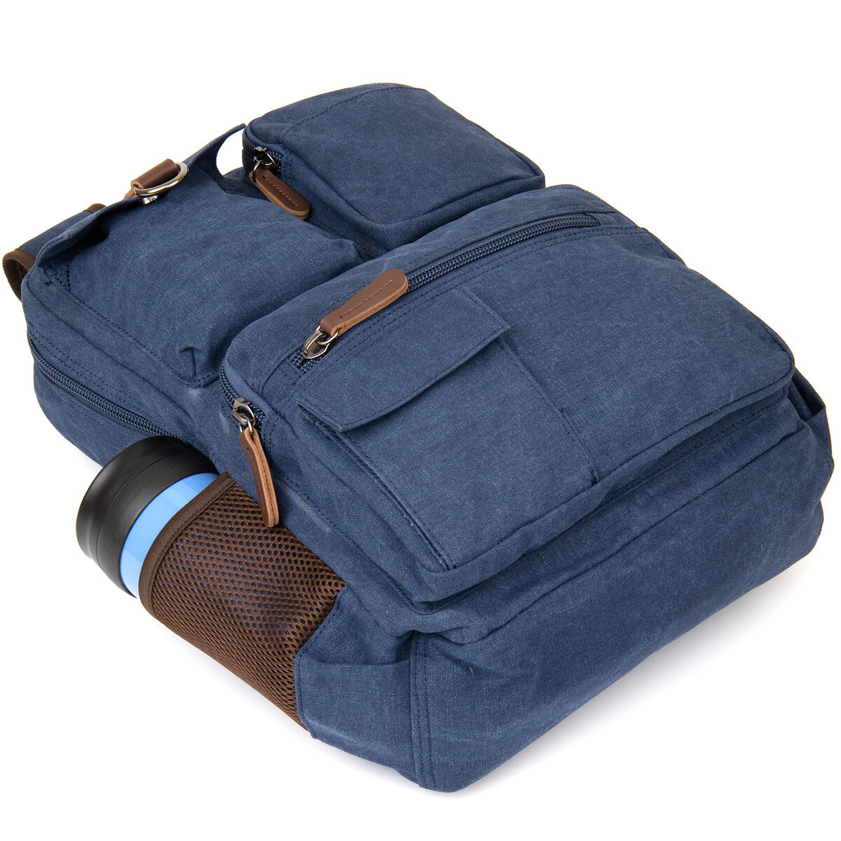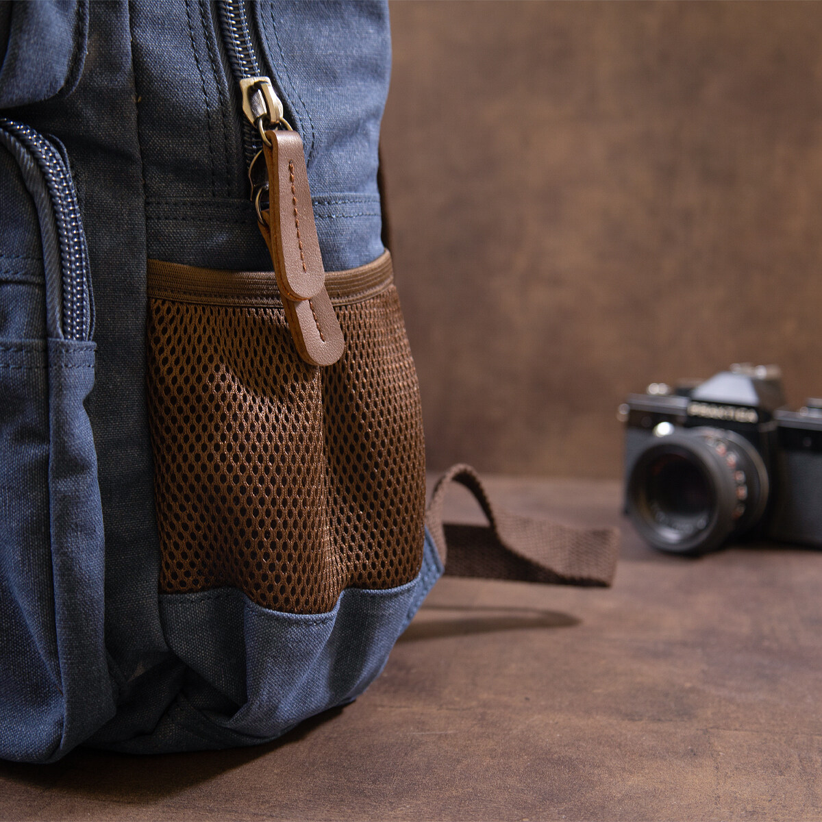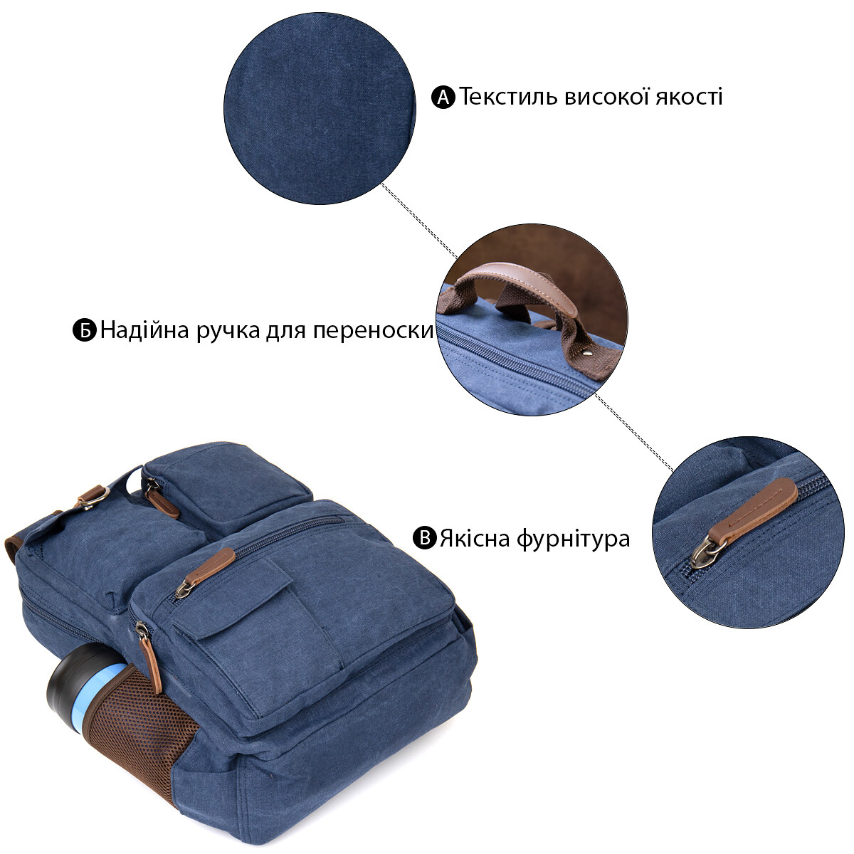 Виріб виконаний з текстилю синього кольору. Матеріал легкий, зручний у використанні та добре підходить для активної експлуатації. На сторінці товару зазначено, що рюкзак неважкий саме завдяки текстильному матеріалу, а синій колір є універсальним і немарким. Усередині передбачена якісна текстильна підкладка коричневого кольору.