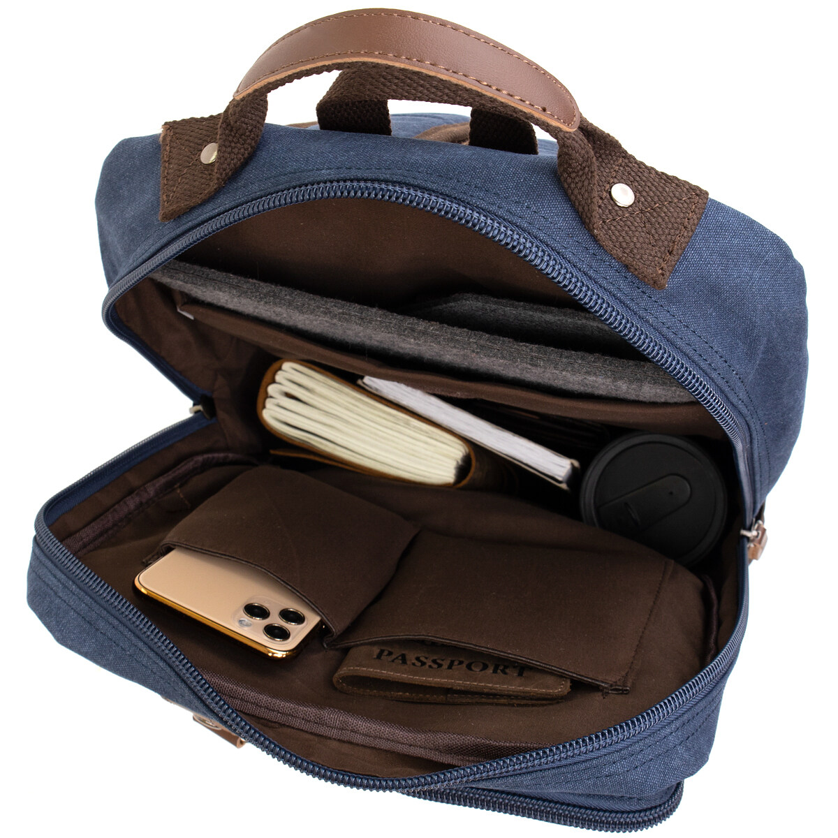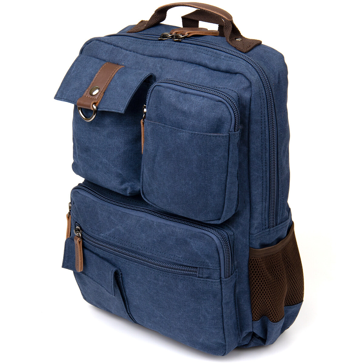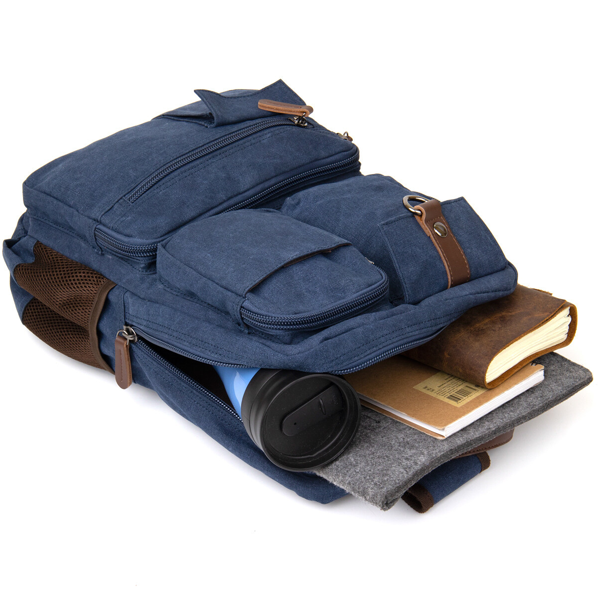 Виріб виконаний з текстилю синього кольору. Матеріал легкий, зручний у використанні та добре підходить для активної експлуатації. На сторінці товару зазначено, що рюкзак неважкий саме завдяки текстильному матеріалу, а синій колір є універсальним і немарким. Усередині передбачена якісна текстильна підкладка коричневого кольору.