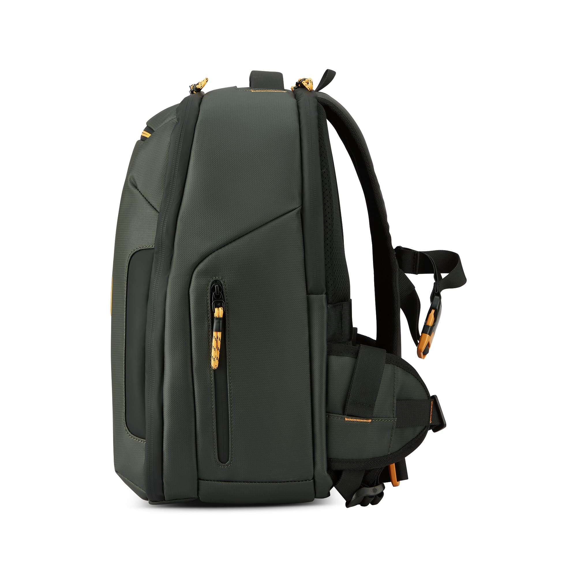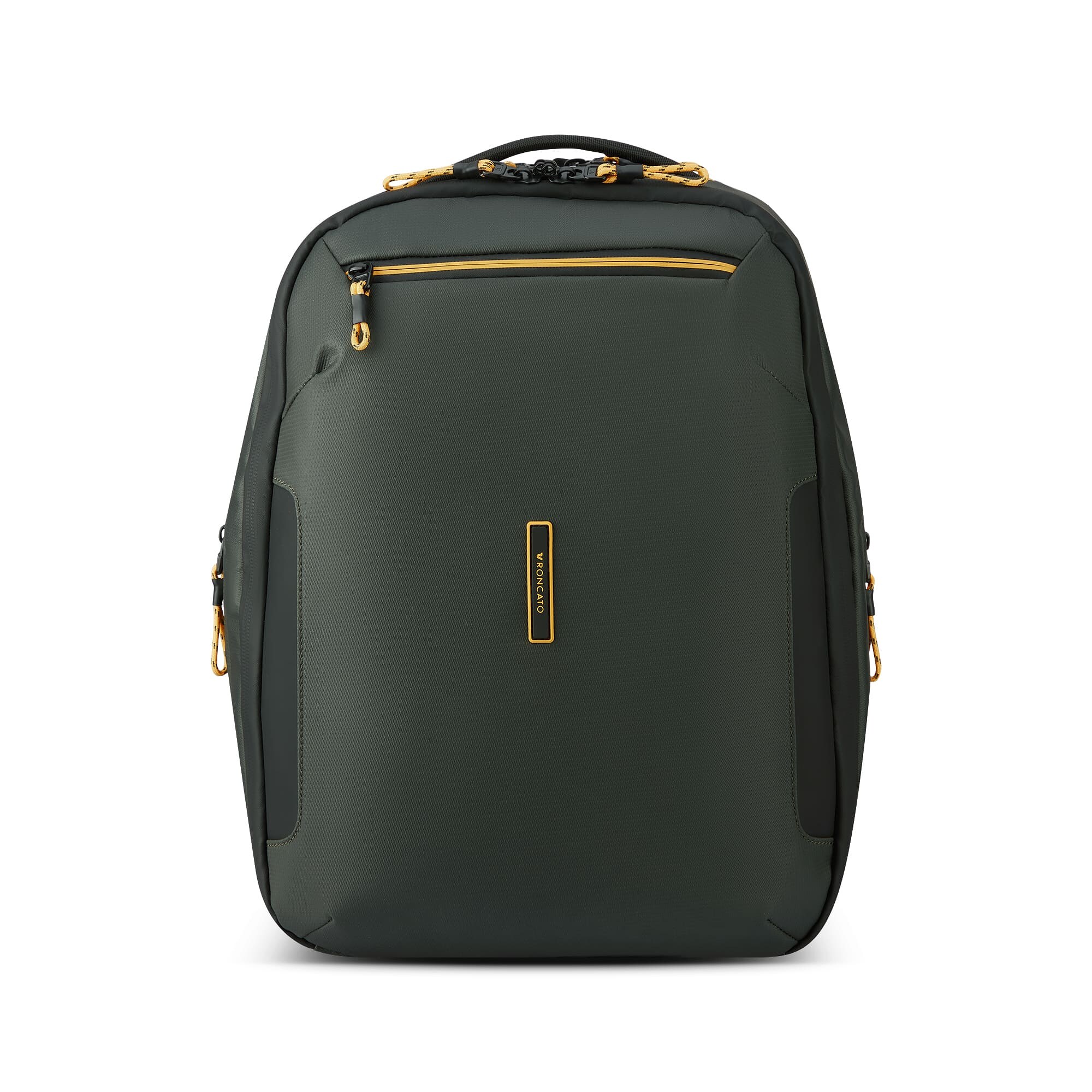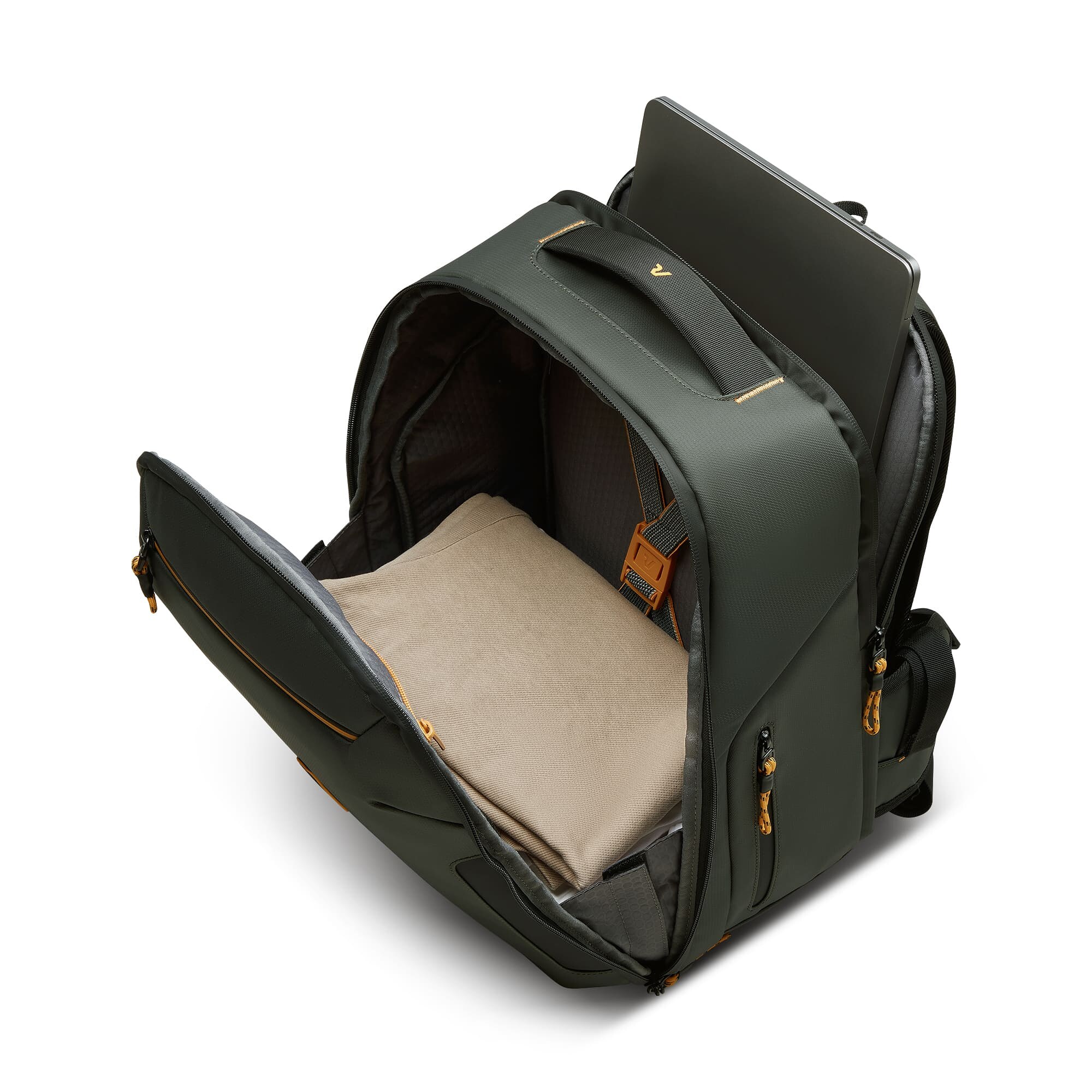 Рюкзак для подорожей-унікальна можливість поєднати особисті речі з сучасними гаджетами. Ідеальний варіант для відряджень в яких Вам знадобляться техніка, предмети першої необхідності і місце для одягу. Вироби колекції виготовлені з хвилястого поліестеру 900D з PU-покиттям, яке захищає від дощу, бризок, вологи й швидко сохне. Виріб оснащений двома основними віддідами, з кишенею для дрібних предметів з сітчастою перегородкою для організації та розділення одягу. Другий відділ призначений для ноутбука 14", планшету та документів. Також, передбачена бічна кишеня для пляшки/парасольки. Для зручності переміщення на задній частині розміщені м'які плечові ремені, планка для фіксації на телескопічній системі валізи, можливість застібнути плечові ремені фіксатором на грудях та ручка для вертикального перенесення.