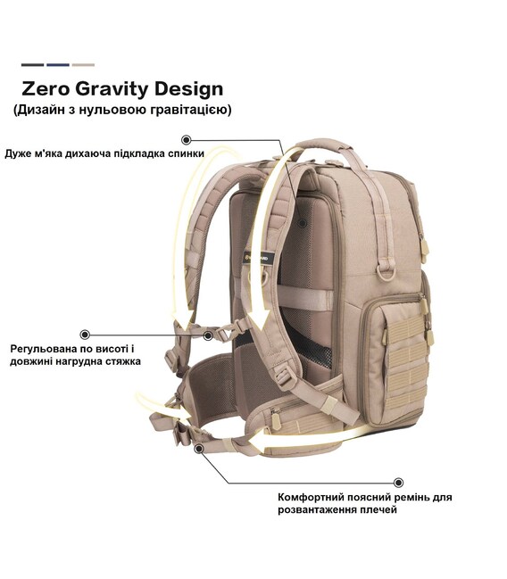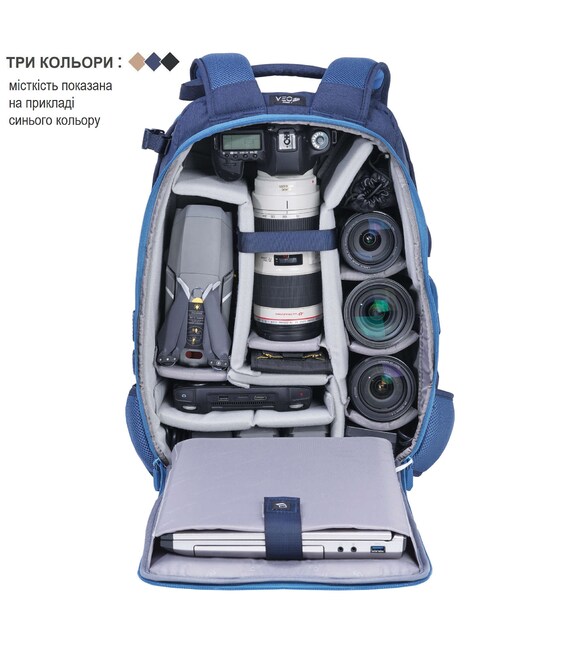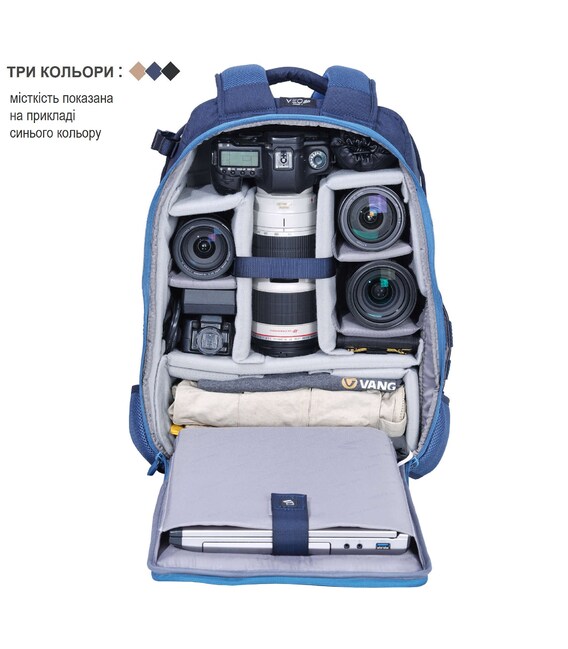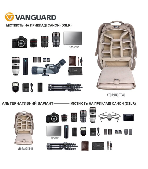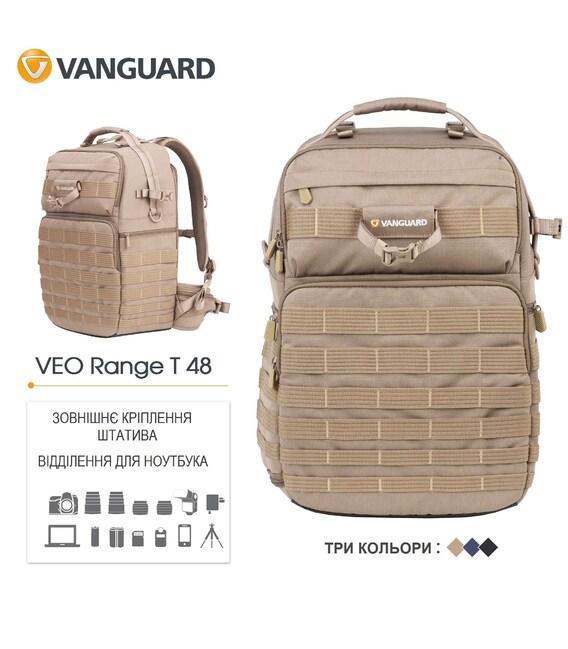 Компанія Vanguard чи не єдина, хто виготовляє тактичні рюкзаки для фотографів та операторів дронів. Маючи зовнішній вигляд тактичного рюкзака, Vanguard VEO Range T 48 створений, щоб надати максимальний захист і зафіксувати розміщене в ньому фотообладнання, та забезпечити швидкий доступ до фотокамери. Рюкзак має широку комплектацію, що включає накидку від дощу, тримач для фляги та систему кріплення штативу. Завдяки модульній системі зовнішнього кріплення на рюкзаку практично в