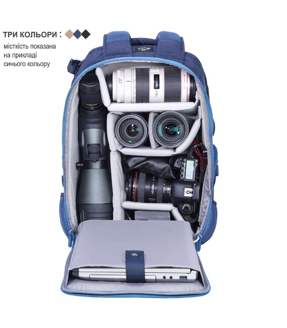 - Модульна система. Знімні м'які внутрішні розділювачі поділяють внутрішній простір рюкзака на десять відділень і фіксують камеру і аксесуари всередині рюкзака;