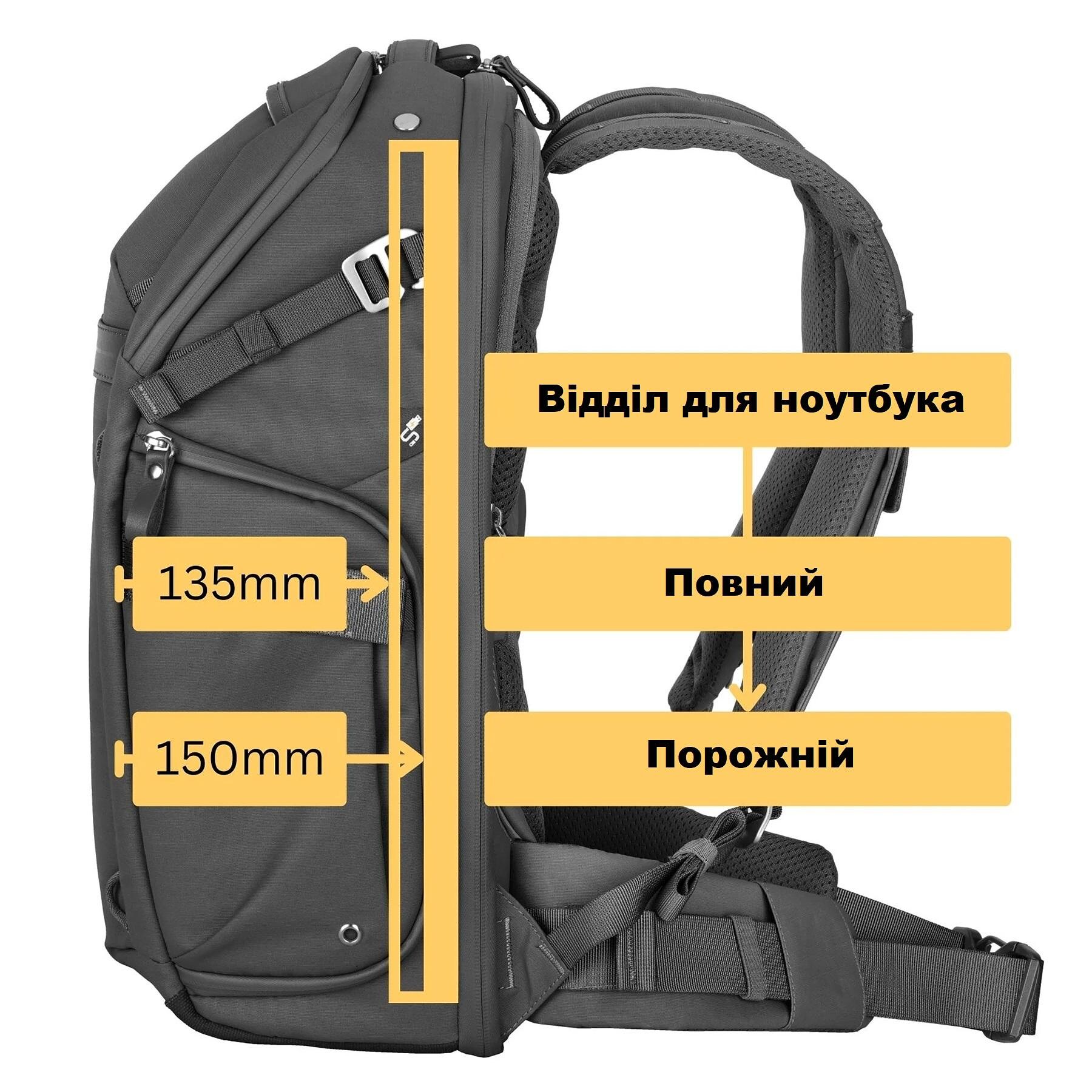 Окреме відділення для ноутбука до 17" та планшета до 13" розташоване у задній панелі й добре захищене. Передбачені численні кишені: внутрішні для карт пам’яті та аксесуарів, зовнішні для смартфона чи дрібних речей, прихована кишеня для документів. Бокові кишені розширюються для штатива чи пляшки з водою, а передні стропи (йдуть в комплекті) дозволяють закріпити додаткові речі, наприклад куртку.