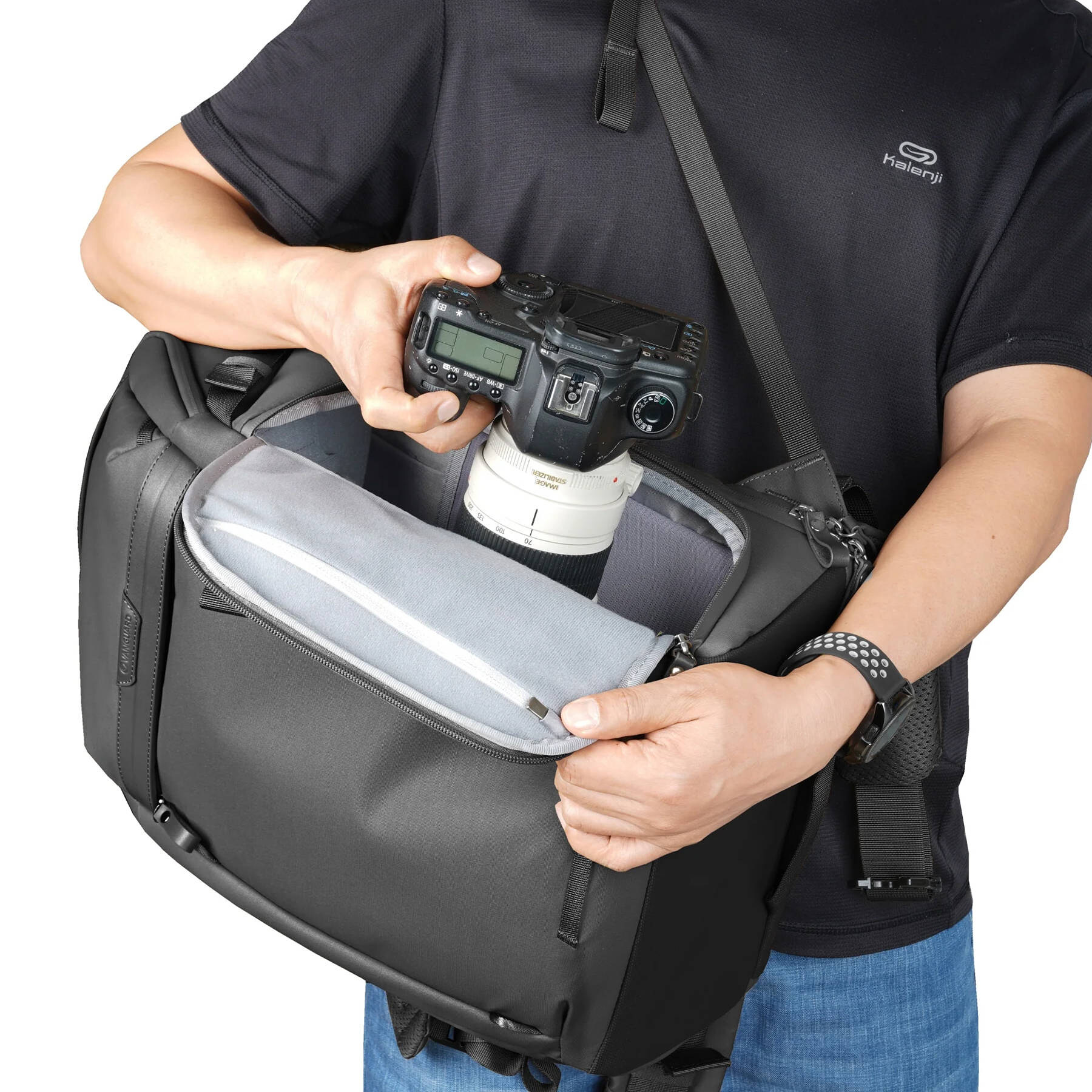 Рюкзак здатний вмістити повноцінну DSLR-камеру з об’єктивом та до 5 змінних об’єктивів (до 70–200 мм f/2.8), невеликий дрон, фотоспалах та аксесуари, збоку закріпити штатив. Доступ до камери здійснюється через тильну панель, а також є швидкий боковий доступ, що дозволяє бути готовим до зйомки за секунди. Верхній відділ рюкзака призначений для особистих речей або додаткової техніки, і його можна зняти за потреби.