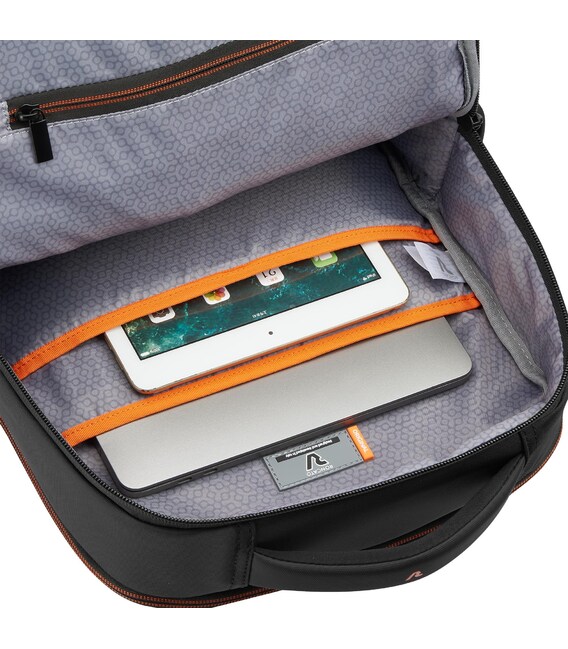 Рюкзак виготовлений з переробленої тканини PET і PU (пластик). Оснащений двома основними відділами на блискавці, в яких є можливість розмістити ноутбук, планшет, смартфон, пишучі предмети, візитні картки та необхідні Вам речі. Переднячастина частина виробу має, додаткову, не велику кишеню з водонепроникною блискавкою, також присутні бокові кишені на блискавці для парасольки, води або інших речей. Задня частина виробу оснащена розумним рукавом для кріплення на телескопічну ручку валізи, додатково має мʼяку спинку та плечові ремені. Для зручності перенесення обладнаний протиковзкою ручкою.