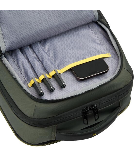 Рюкзак виготовлений з переробленої тканини PET і PU (пластик). Оснащений двома основними відділами на блискавці, в яких є можливість розмістити ноутбук, планшет, смартфон, пишучі предмети, візитні картки та необхідні Вам речі. Переднячастина частина виробу має, додаткову, не велику кишеню з водонепроникною блискавкою, також присутні бокові кишені на блискавці для парасольки, води або інших речей. Задня частина виробу оснащена розумним рукавом для кріплення на телескопічну ручку валізи, додатково має мʼяку спинку та плечові ремені. Для зручності перенесення обладнаний протиковзкою ручкою.
