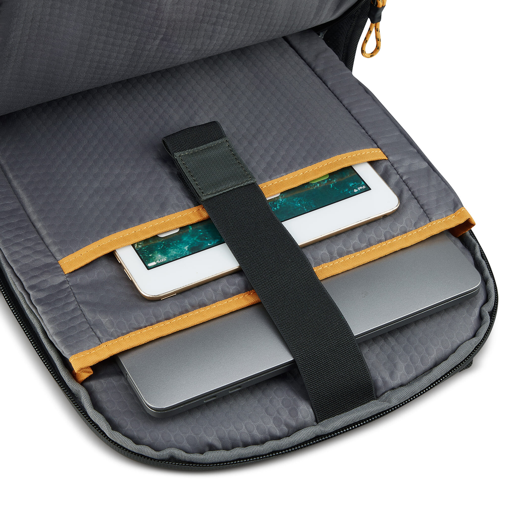 Рюкзак для подорожей-унікальна можливість поєднати особисті речі з сучасними гаджетами. Ідеальний варіант для відряджень в яких Вам знадобляться техніка, предмети першої необхідності і місце для одягу. Вироби колекції виготовлені з хвилястого поліестеру 900D з PU-покиттям, яке захищає від дощу, бризок, вологи й швидко сохне. Виріб оснащений двома основними віддідами, з кишенею для дрібних предметів з сітчастою перегородкою для організації та розділення одягу. Другий відділ призначений для ноутбука 15.6", планшету та документів формату А4. Також, передбачена бічна кишеня для пляшки/парасольки. Для зручності переміщення на задній частині розміщені м'які плечові ремені, планка для фіксації на телескопічній системі валізи, можливість застібнути плечові ремені фіксатором на грудях та ручка для вертикального перенесення.