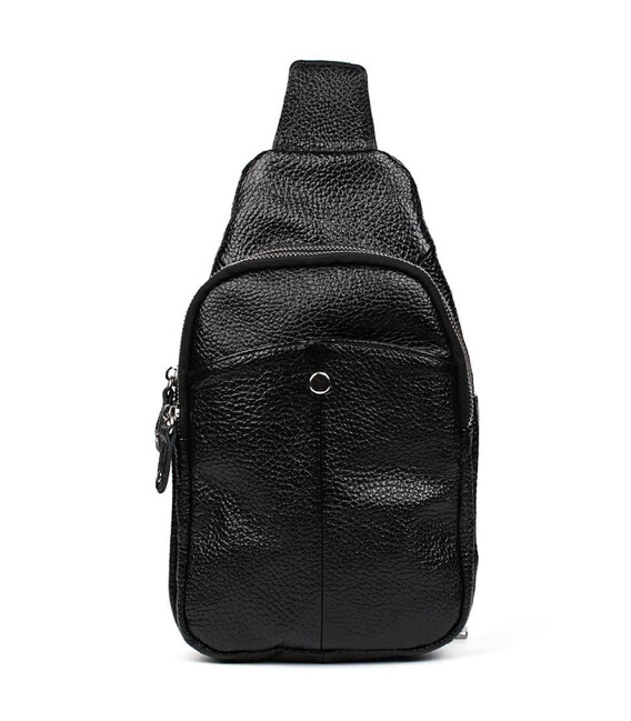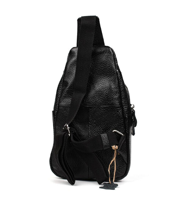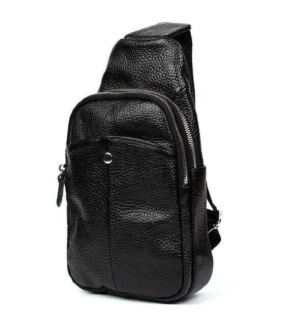 Нагрудна сумка шкіряна слінг рюкзак на одне плече Limary lim-7510 із чорної шкіри флотар. Матеріал нагрудної сумки: натуральна шкіра флотар Одне основне відділення на спіральній блискавці Передня горизонтальна кишеня на блискавці Розмір: 29*16*8 см