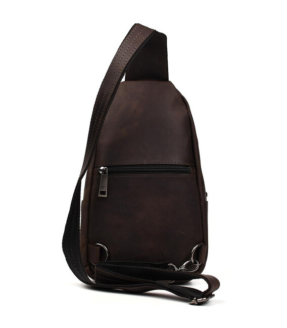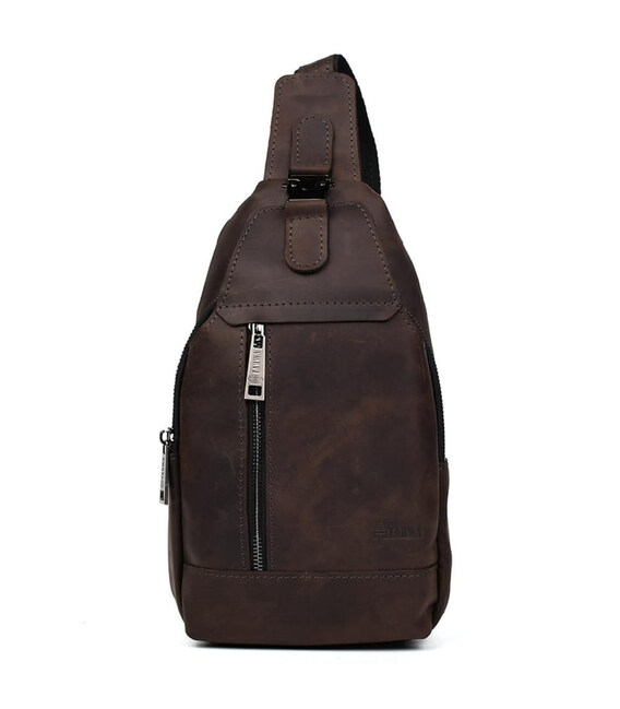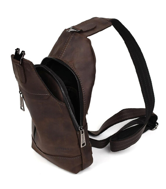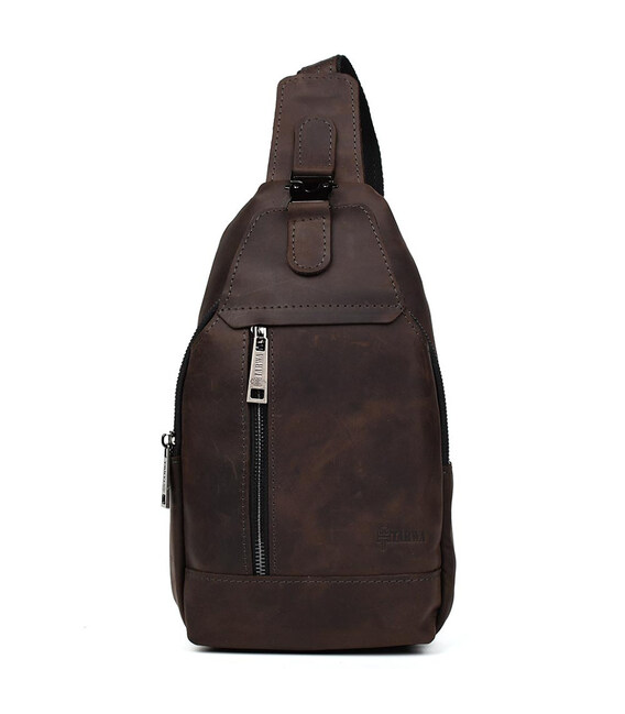 Чоловічий рюкзак шкіряний слінг коричневий TARWA RC-0116-3md - зручний слінг на одну шлейку на ліве або праве плече. Одне основне велике відділення на блискавці та друге відділення дещо менше під клапаном із фастексом. Передня вертикальна кишеня на блискавці, кишеня на блискавці на тильній стороні горизонтальна