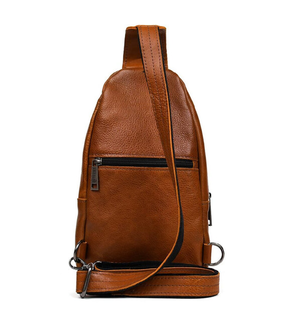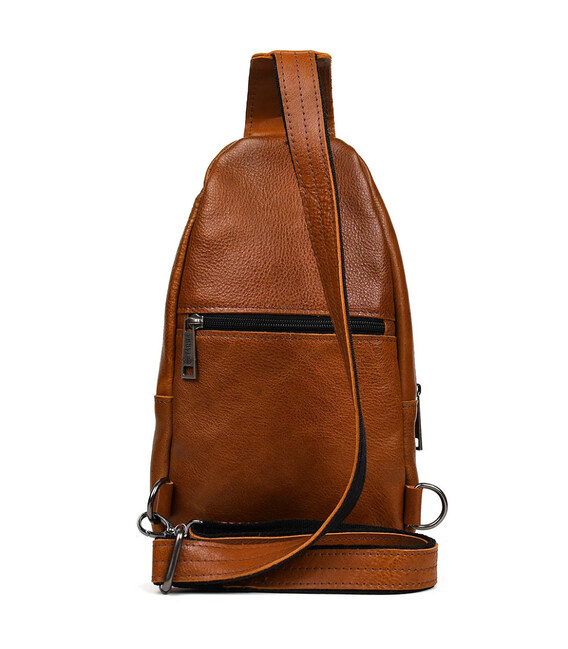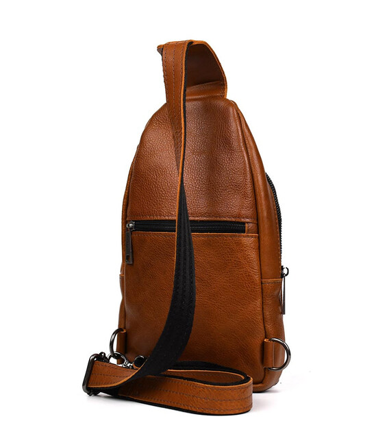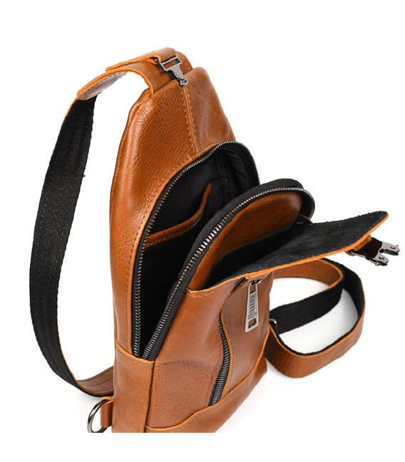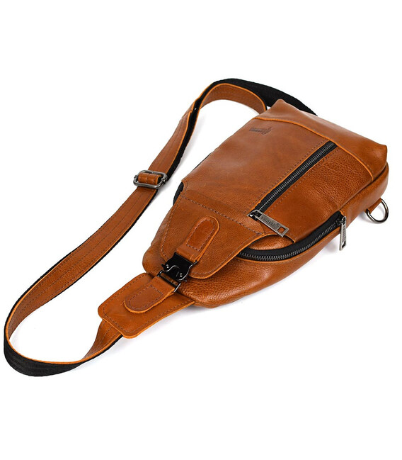Чоловічий рюкзак слінг шкіряний коньяк TARWA GB-0116-3md - зручний слінг на одну шлейку на ліве або праве плече. Одне основне велике відділення на блискавці та друге відділення дещо менше під клапаном із фастексом. Передня вертикальна кишеня на блискавці, кишеня на блискавці на тильній стороні горизонтальна