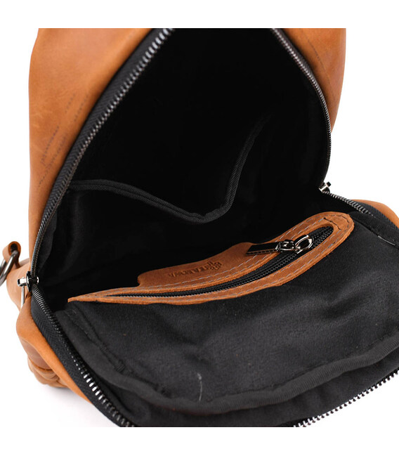 Рюкзак слінг шкіряний обємний з кишенями TARWA RB-6010-3md: на лицьовій стороні дві горизонтальні кишені на блискавці; на тильній стороні - дві кишені на блискавці; всередині відділ для портмоне, кишеня на блискавці, дві відкриті кишені