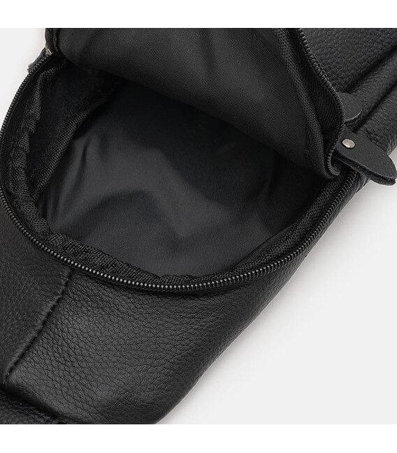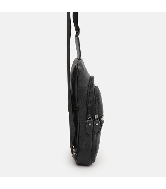 Чоловічий рюкзак через плече виконаний із натуральної шкіри. Має 1 основне відділення на блискавці. З лицьового боку-2 кишені на блискавці, з тильної -1 кишеня на блискавці. Підкладка текстилю. Незнімний текстильний ремінь регулюється довжиною.