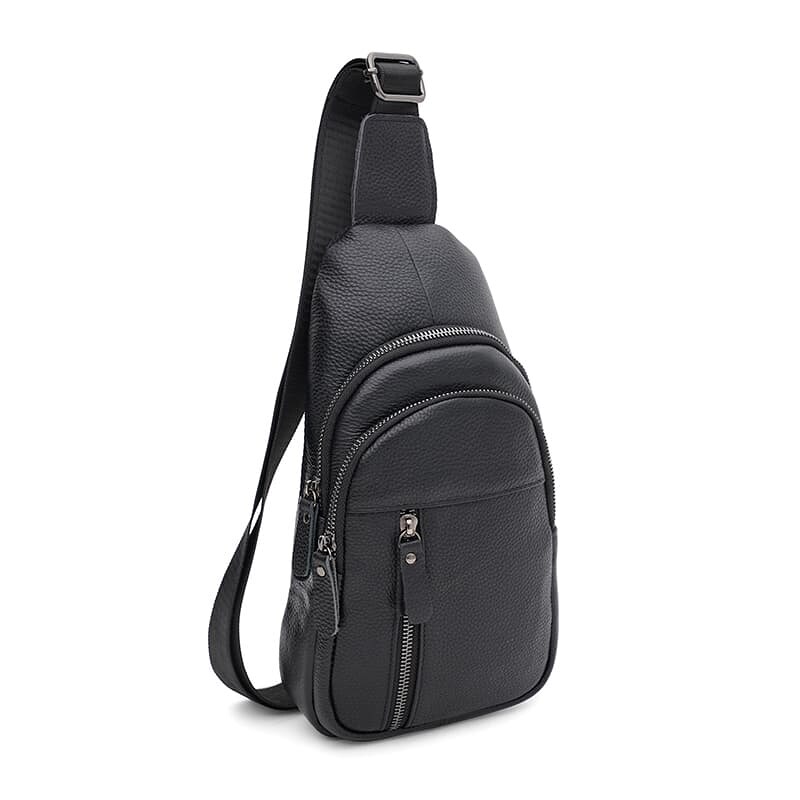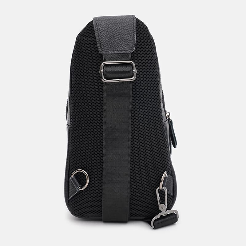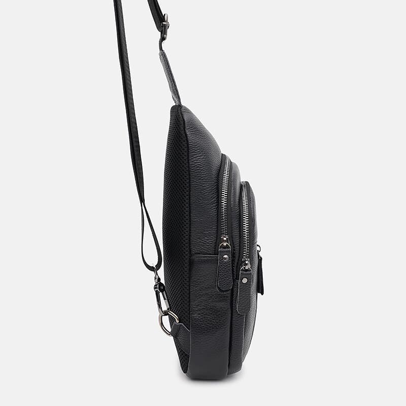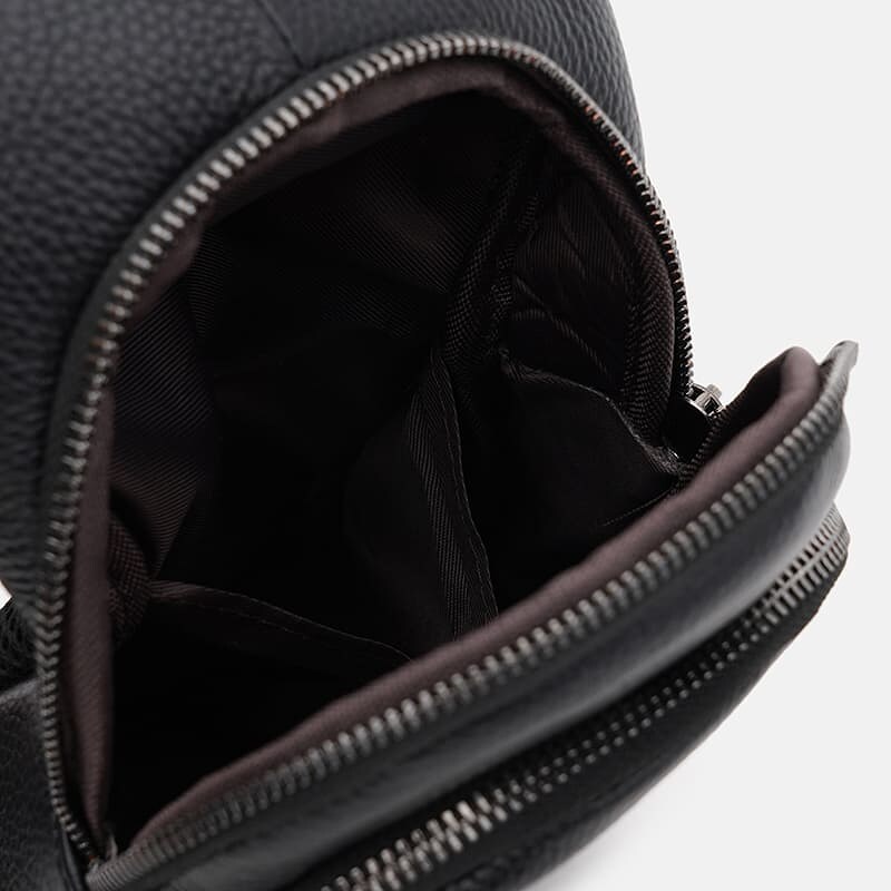 Чоловічий рюкзак через плече виконаний із натуральної шкіри. Має 1 основне відділення на блискавці та 1 кишеню. З лицьового боку 2 кишені. Підкладка-текстиль. Знімний плечовий ремінь регулюється по довжині, кріплення ліворуч та праворуч.