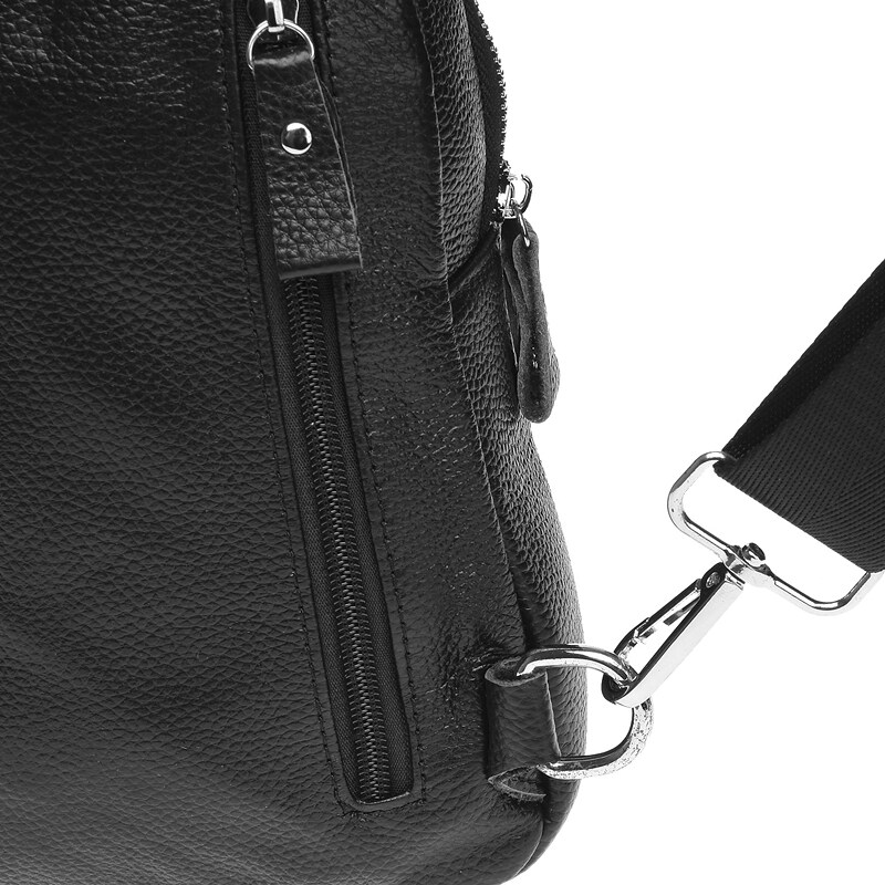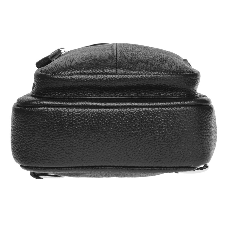Рюкзак через плече з натуральної шкіри. Має 1 відділення на блискавці, всередині 1 кишеня на блискавці. З лицьового боку-2 кишені на блискавці. З тильного боку-1 вертикальний кишеню на блискавці. Підкладка текстиль. Колір фурнітури срібло. Плечовий ремінь регулюється по довжині.